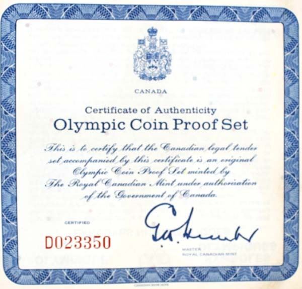 Canadian Olympic Coin Proof Set, comes with COA, in original box and display, Certified D023350, minted by The Royal Canadian Mint under authorization of the Government of Canada, Copyright 1972 COJO 1976, this series represents the second of seven to be minted under this authority, all Olympic coins contain 92.5% silver and 7.5% copper alloy