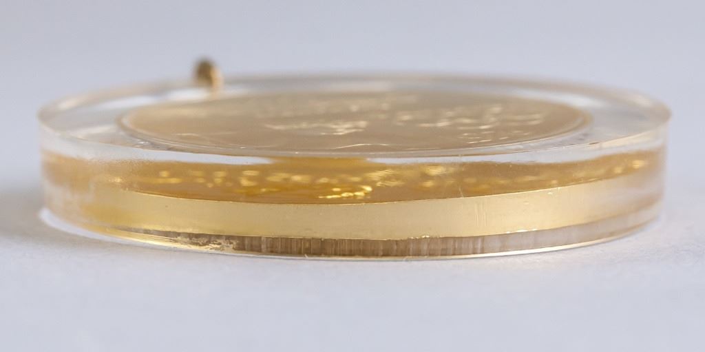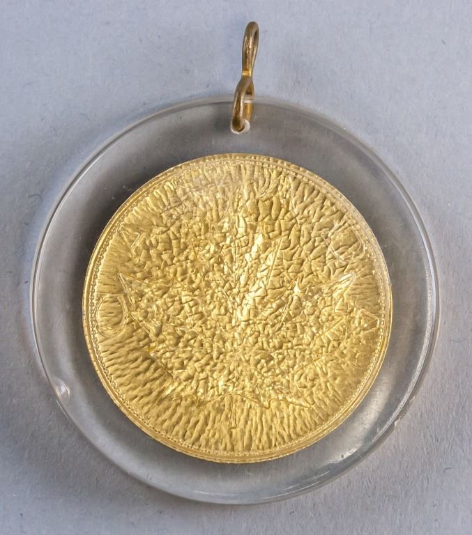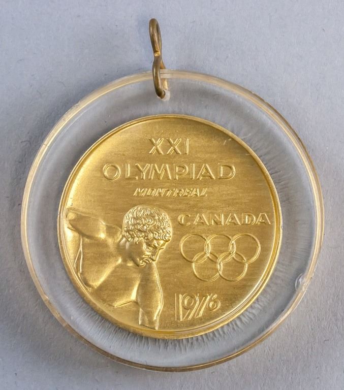 Canadian token. Of gold tone. Obverse: XXI OLYMPIAD MONTEAL CANADA [Olympic rings] 1976. Encased in plastic, punctured for suspension. Diameter: 5 cm, 23 grams.