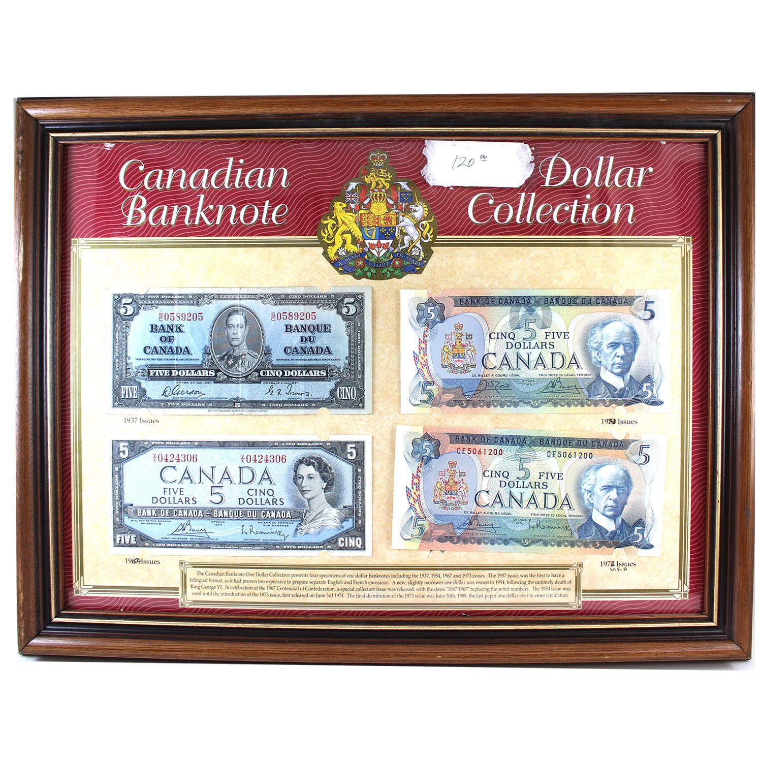 Includes an example of 1937, 1954, 1972 & 1979 $5 banknotes. Sticker on front of frame
