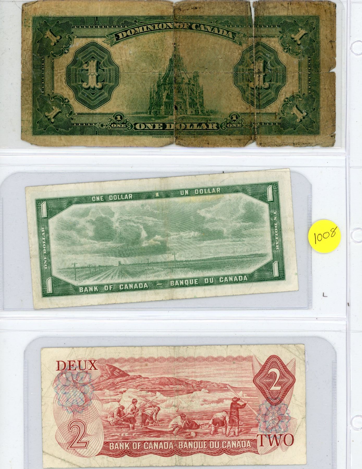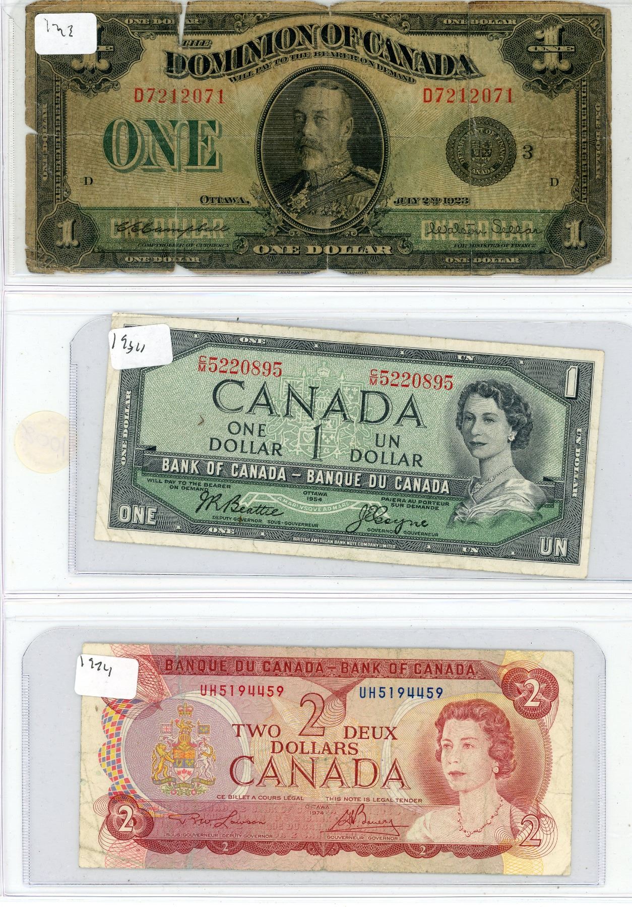 Canadian One and Two Dollar Bank Notes 1923, 1954, and 1974