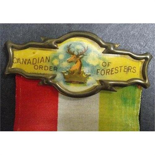BEAUTIFUL AND COLORFUL PIN DEPICTING CREST AND SIGNATURE OF CANADIAN ORDER OF FORESTERS,WITH WIDE RIBBON ATTACHED, WHICH HAS GOLD FRINGE, AND PRINTED GOLD CREST SIGNED CANADIAN ORDER FORESTERS,IT IS DOUBLE RIBBON SHOWING IN BLACK AND SILVER PRINT IN MEMORIAM - as per images - it is in very good condition, but for a small, partial break in fabric due to age, Pin with ribbon measures about 9" long and 2 3/4" wide.US Buyer to pay 5.00 for shipping plus insurance.THANKS.