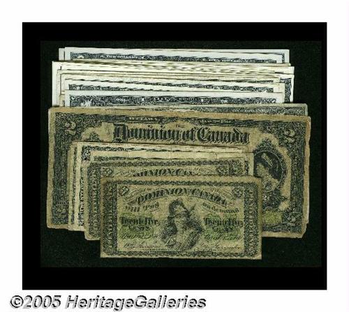 <B>Canadian Paper Money Group Lot,</B></I> including two 1870 Shinplasters <B>VG</B></I>; seven 1900 Shinplasters <B>VG or better;</B></I> 1923 Shinplaster <B>VG;</B></I> $2 1914 DC-22a-i <B>G-VG;</B></I> $1 1923 DC-25o <B>Fine;</B></I> $1 1937 <B>AU:</B></I> $1 1954 Devil's Hair <B>VG;</B></I> eight $1 1954 Modified Hair <B>Fine or better;</B></I> eight Centennial $1s with serial numbers <B>AU or better,</B></I> five Centennial $1s without serial numbers <B>Choice CU;</B></I> two $2 1954 Devil's Hair <B>Fine;</B></I> and three $2 1954 Modified Hair <B>Fine or better.</B></I><BR>