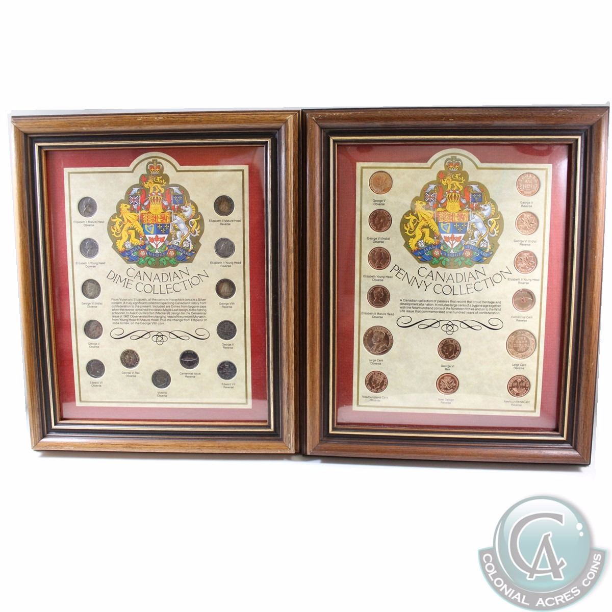 Canadian Penny and Dime Collections in Wooden Frames. These 14-coin and 13-coin sets feature the obverse and reverse of every Canadian 1-cent and 10-cent example up to Elizabeth II.