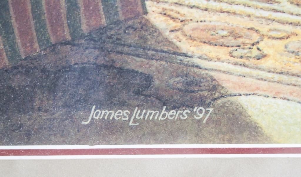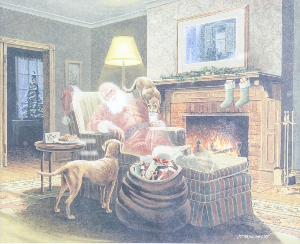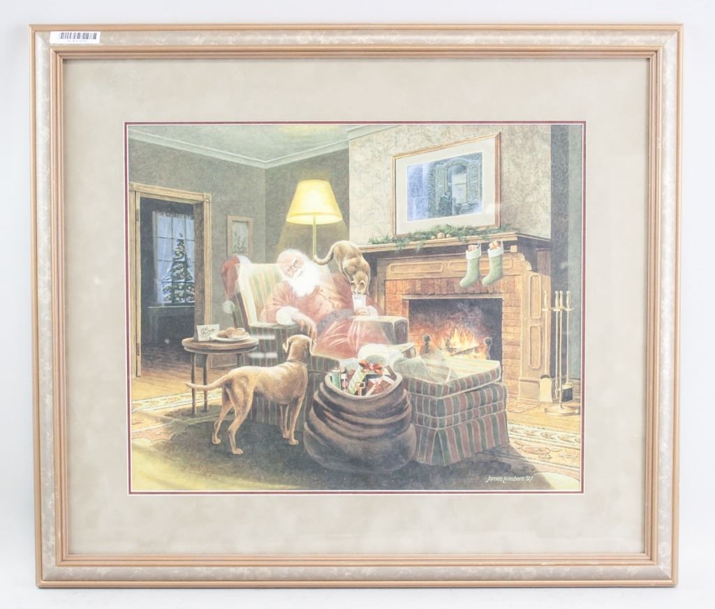 Print on paper, framed. Featuring a ghostly Santa Claus holding a glass of milk, seated on the couch. "James Lumbers '97" printed to the bottom right. Attributed to James Lumbers (Canadian). Paper size: 33 x 40.5 cm (13 x 16 inches). Frame size: 51.5 x 59 cm (20.25 x 23.25 inches).