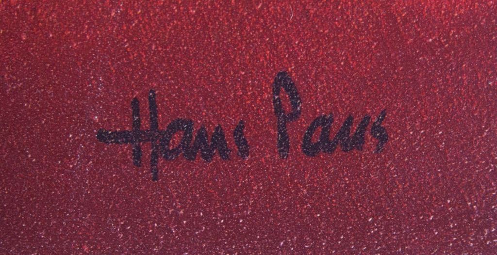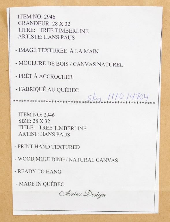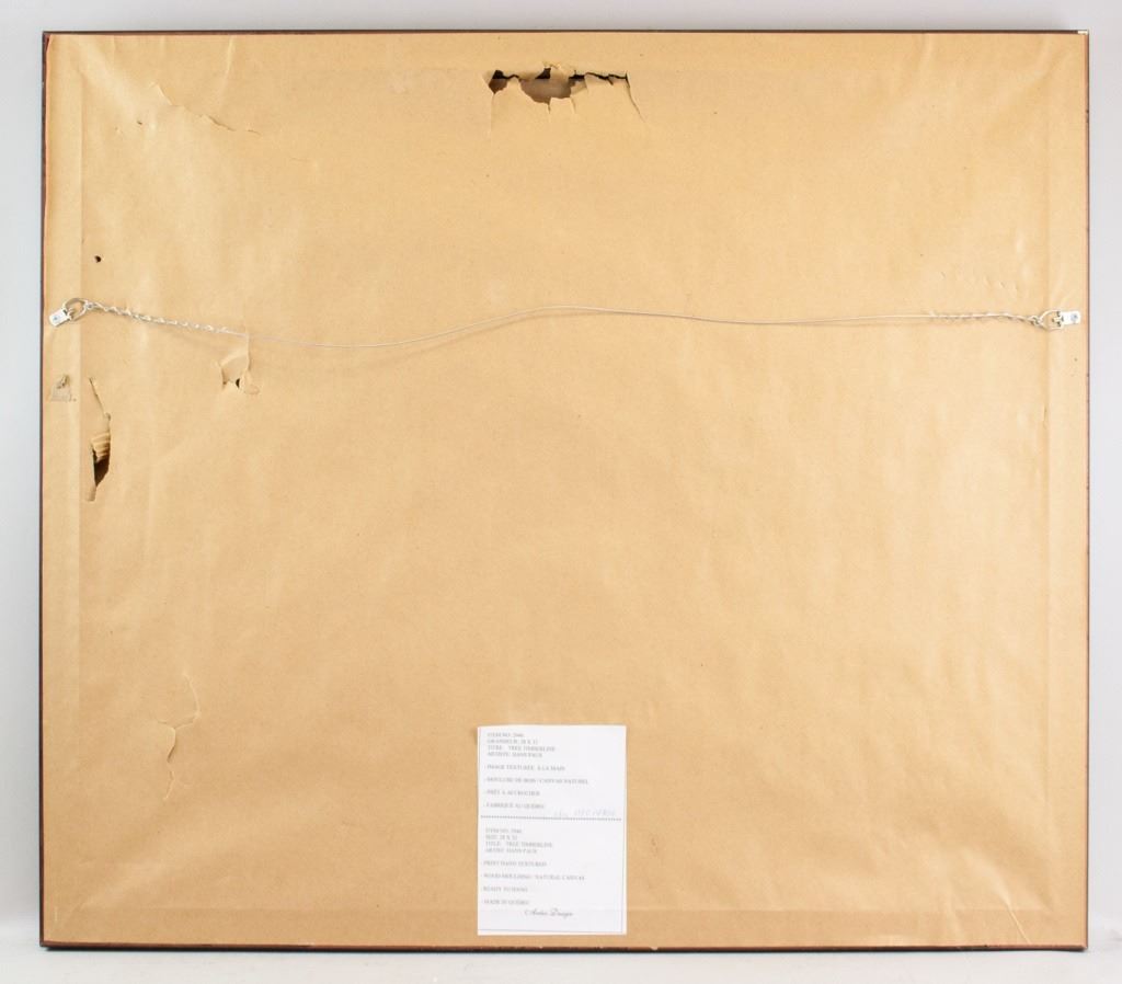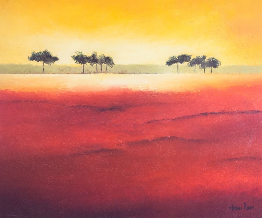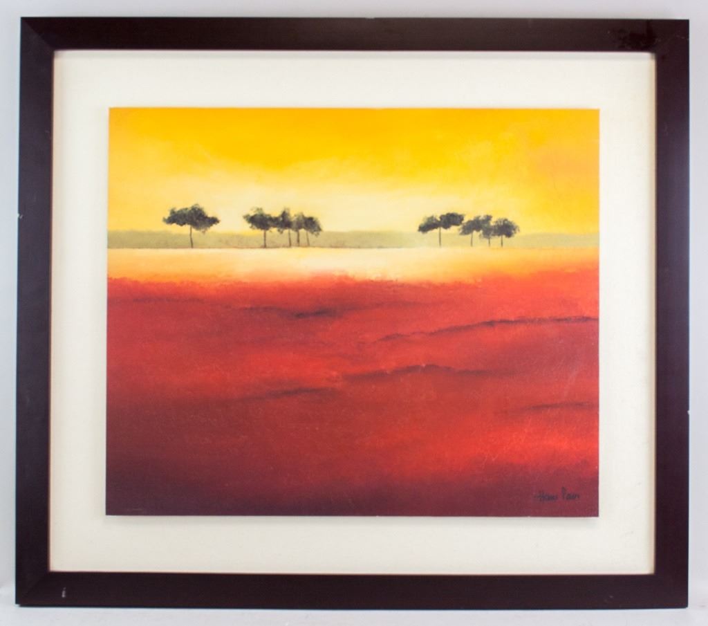 Print on textured board, framed. Featuring sunset landscape with a few trees in the distance. "Hans Paus" printed to the bottom right corner. Label on verso reads, in part, "TITLE: TREE TIMBERLINE / ARTIST: HANS PAUS / PRINT HAND TEXTURED". Board size: 50 x 60 cm (19.5 x 23.5 inches). Frame size: 72 x 82 cm (28.25 x 52.25 inches).