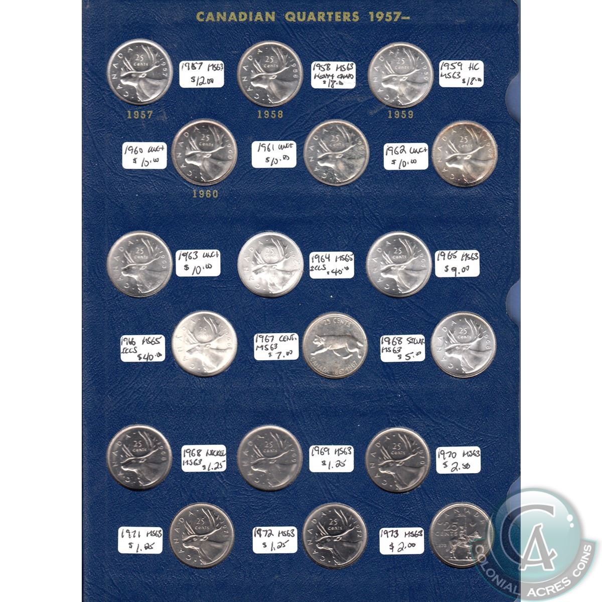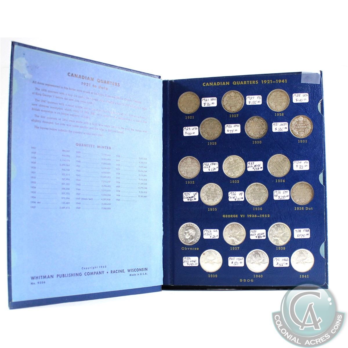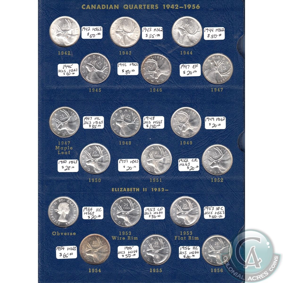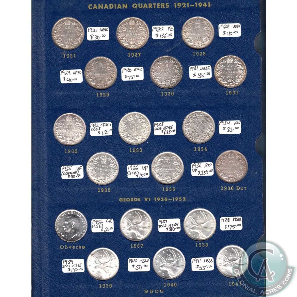 Canadian Quarter Collection 1921-1973 housed in a deluxe Whitman album: Binder Consists of George V 1921 – 1936 GRADE; VG – AU50 (1936 DOT VF20) GEORGE VI 1937 – 1952 GRADE; EF – MS63 (1938, 1939, 1948 MS63) ELIZABETH II 1953 – 1973 GRADE; MS60 – MS65 1932 CCCS, 1933, 1937, 1939, 1945, 1947ML, 1948, 1953LD, 1953 SD C, 1955, 1956 HC 1964 & 1966 (MARKED ON DATE IN ALBUM)