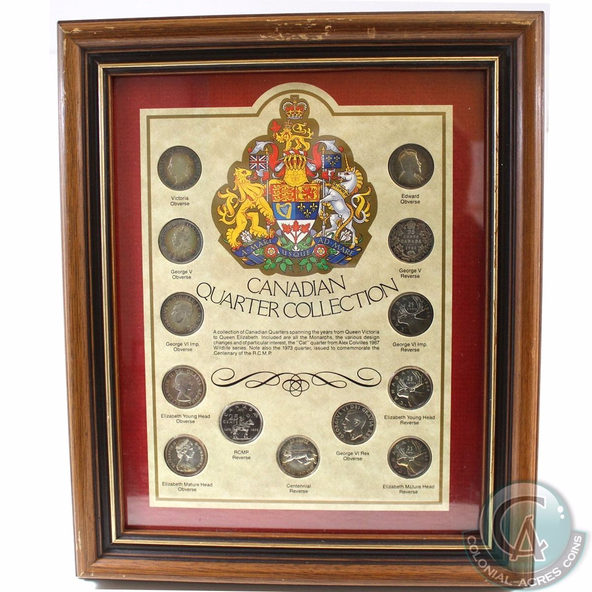Canadian Quarter Collection in Wooden Frame. This 13-coin set features the obverse and reverse of every Canadian 25-cent example up to Elizabeth II with RCMP reverse.