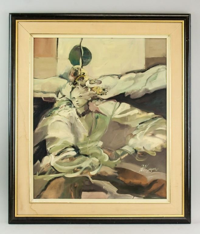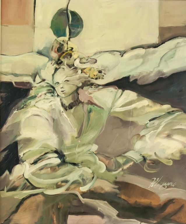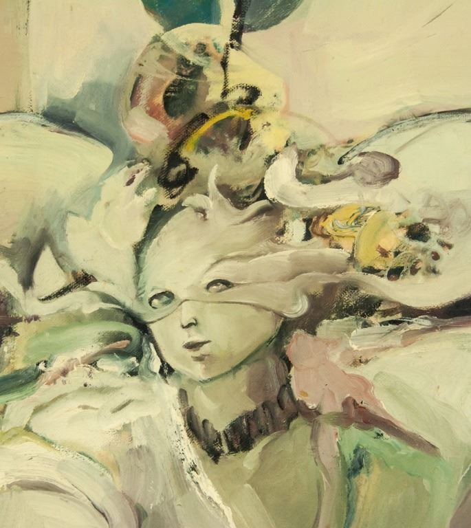 Oil on canvas, framed. Featuring portrait of a woman wearing half a mask, covering her eyes. Signed "JP Lafrane" to the bottom right. "LE TROISEME INVITE / 20"x 20" Huile / Jean-Pierre Lafrane" inscribed on verso. Canvas size: 60 x 48 cm (23.5 x 18.5 inches). Frame size: 79 x 66 cm (31 x 26 inches).