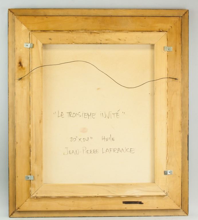 Oil on canvas, framed. Featuring portrait of a woman wearing half a mask, covering her eyes. Signed "JP Lafrane" to the bottom right. "LE TROISEME INVITE / 20"x 20" Huile / Jean-Pierre Lafrane" inscribed on verso. Canvas size: 60 x 48 cm (23.5 x 18.5 inches). Frame size: 79 x 66 cm (31 x 26 inches).