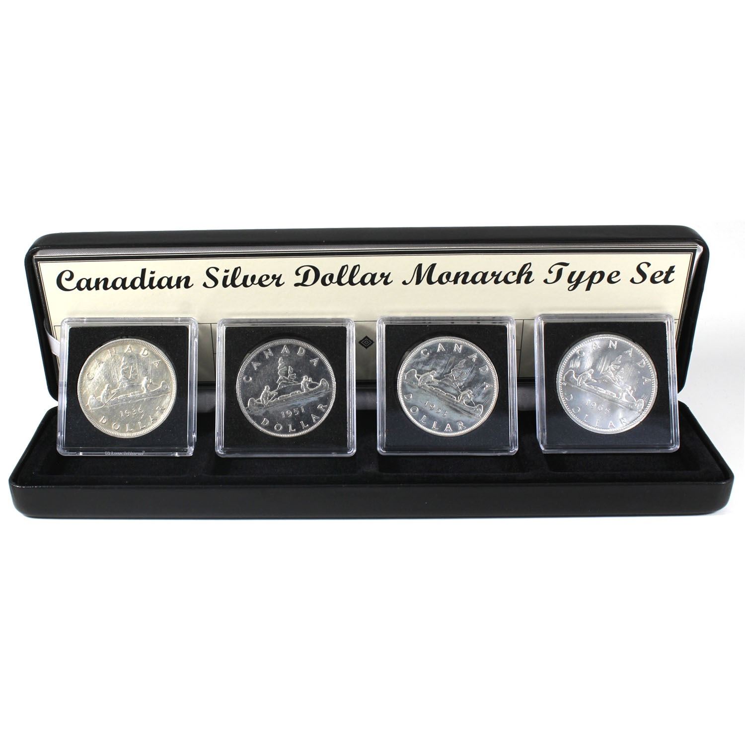 Canadian Silver Dollar 4-coin Monarch Type Set Featuring all the Monarch Portraits on Canadian Silver Dollars Throughout History. Coins come encapsulated in black display case.