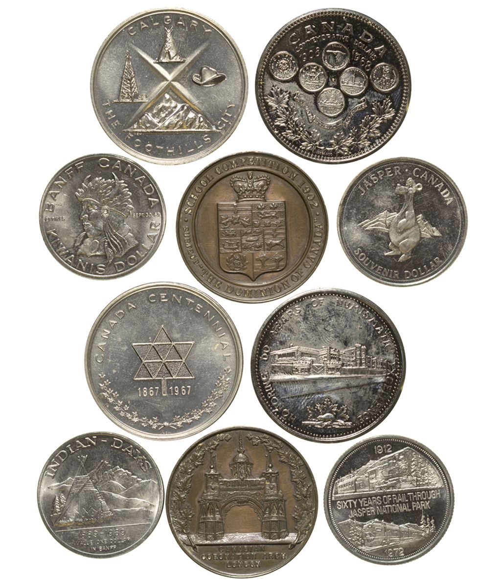 Lot of 5: 1) Canada Centennial, 1967, BU; 2) Honoring 60 years of Numismatic Excellence, 1968, BU; 3) Jasper souvenir dollar, 1972, BU; 4) Banff Kiwanis dollar, 1969, BU; 5) Canadian School Medal, 38mm, bronze 1902, AU.City: County: State: CanadaDate: