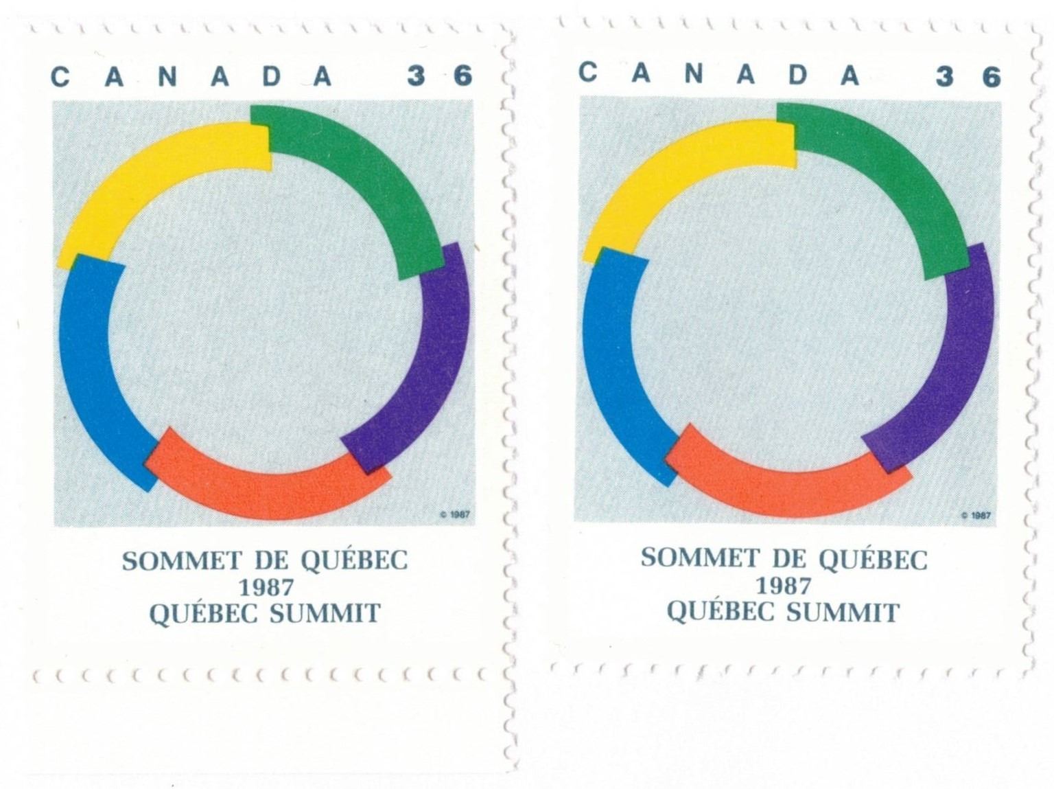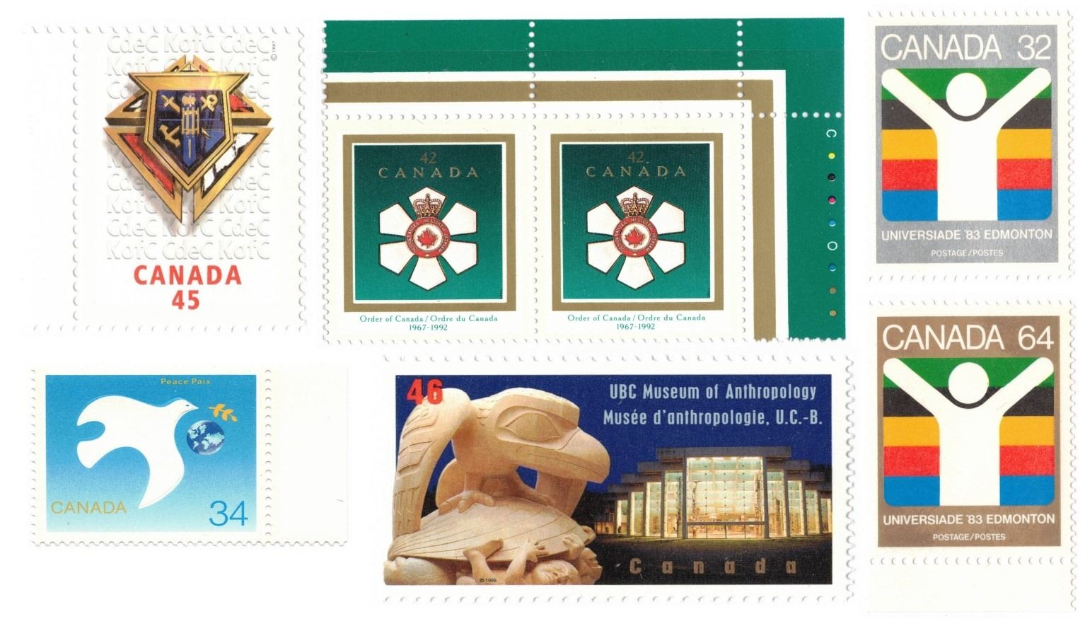 981 World University Games, 32 cent silver & multicolour, 28 June 1983, MVF NH; 982 World University Games, 64 cent multicolour, 28 June 1983, MVF NH; 1110 UN: International Year of Peace, 34 cent multicolour, 16 Sept 1986, MVF NH; 1146 Quebec Summit Synbol X 2, 36 cent multicolour, 2 Sept 1987, MVF NH; 1147 Commonwealth Meeting, 36 cent multicoloured, 13 Oct 1987, MVF NH; 1251 International Trade, 38 cent multicoloured, 2 Oct 1989, MVF NH; 1446 Order of Canada, 42 cent green & multicoloured, 21 Oct 1992, MVF NH; 1558 Lunenburg Academy, 43 cent multicoloured, 29 Jun 1995, MVF NH; 1656 Knights of Columbus, 45 cent multicoloured, 5 Aug 1997, MVF NH; 1756 University of Ottawa, 45 cent multicoloured, 25 Sept 1998, MVF NH; 1769 Le Theatre du Rideau Vert, 46 cent multicoloured, 17 Feb 1999, MVF NH; 1778 UBC Museum of Anthropology, 46 cent multicoloured, 9 Mar 1999, MVF NH; 1810 Frontier College, 46 cent multicoloured, 24 Sept 1999, MVF NH