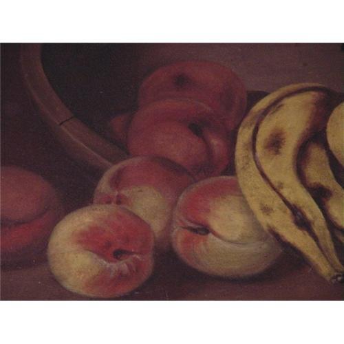 Expertly and carefully rendered, the artist shows a particular brilliance in the gentle way the bananas (an uncommon fruit at the time) have been painted. The peaches?rich in color, perfect in form, show us that Vernor was a true master. The rogue green apple leads us to Vernor?s signature. Symbolism? Perhaps. But, likely just artistic license.