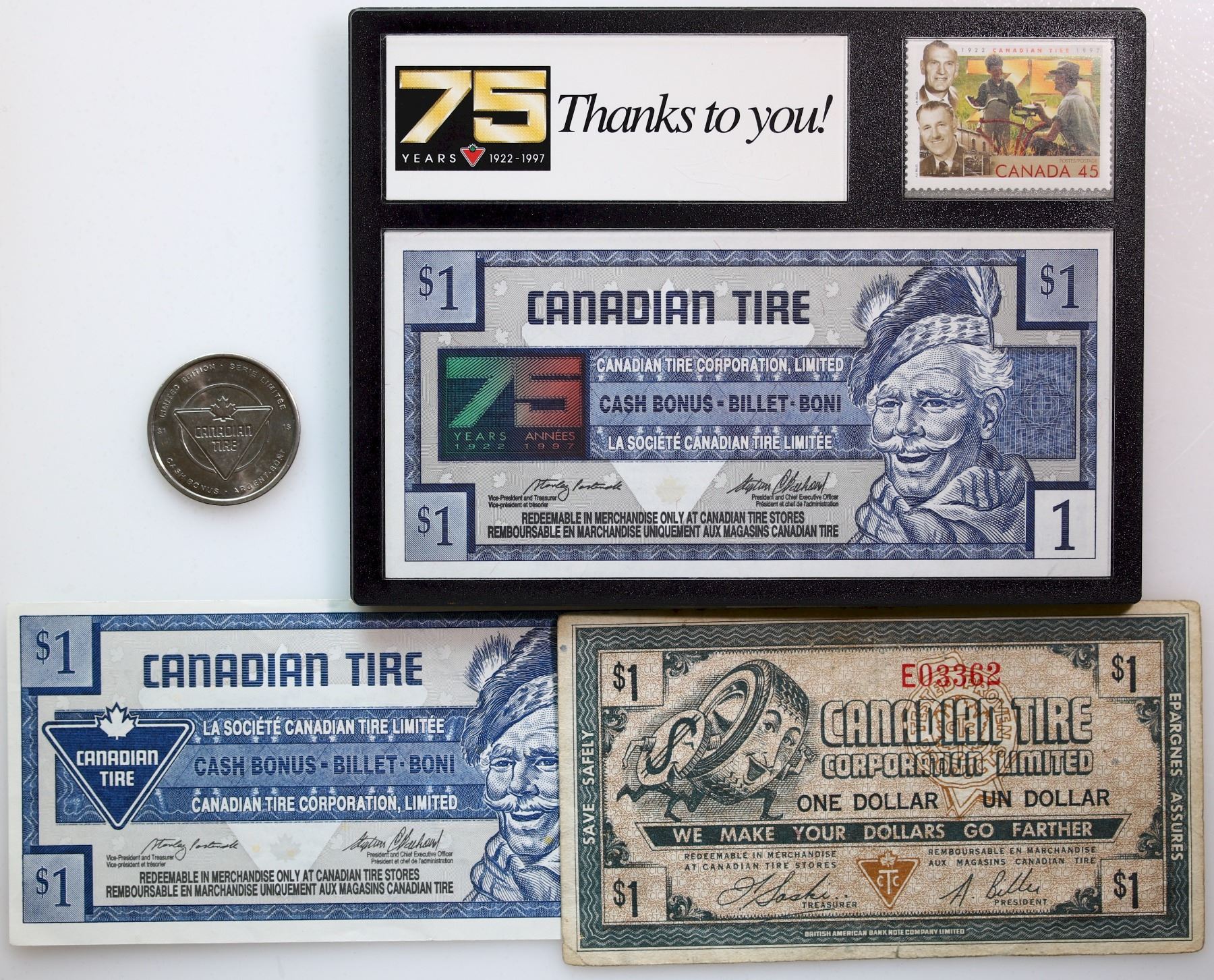 Canadian Tire Money; CTC 1-E $1 rare issue along with 75th Anniversary Special Edition $1 w/stamp and 3rd $1 example. Lot of 3 issues alon with CT token.