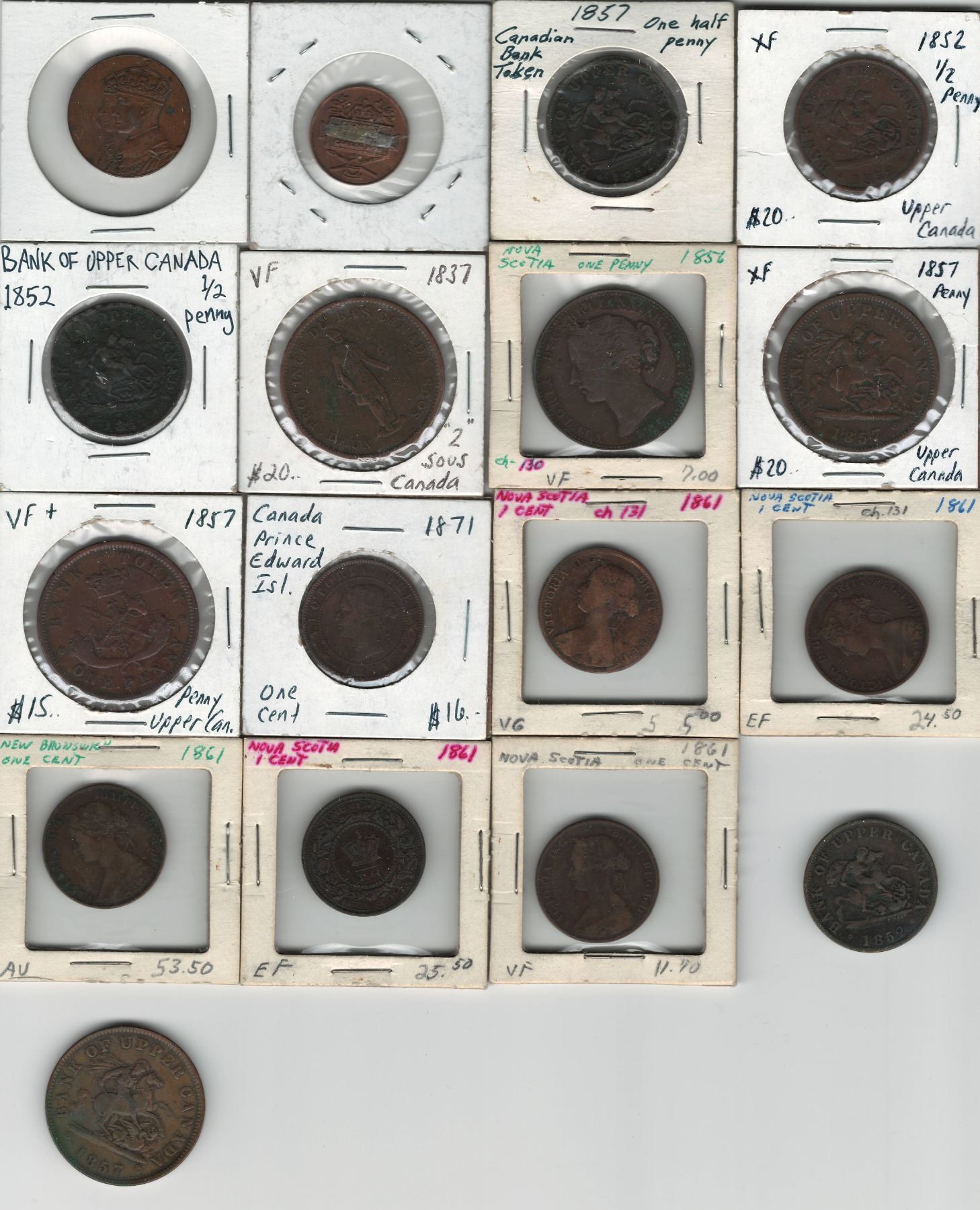 Canadian Token & Provincial Penny Lot. (17 pcs.) 6 provincial large cents. 9 pre-confederation tokens. 2 post confederation tokens.