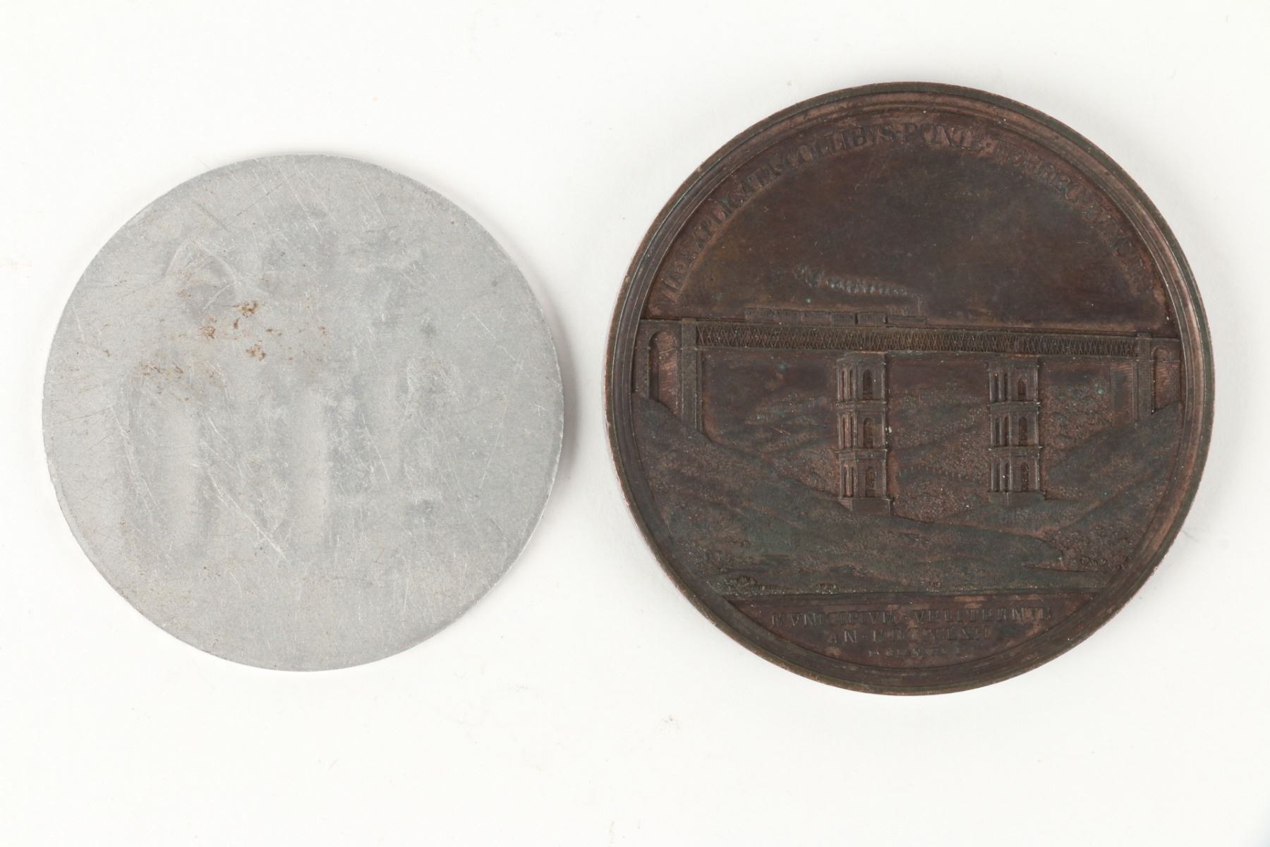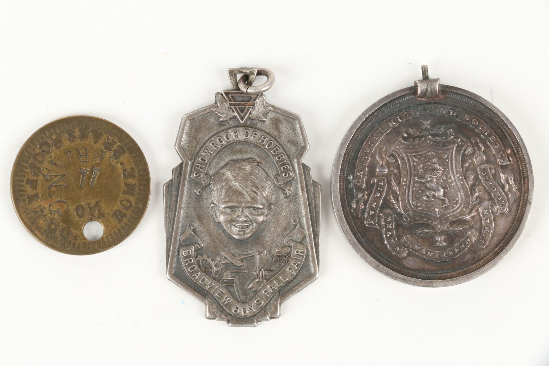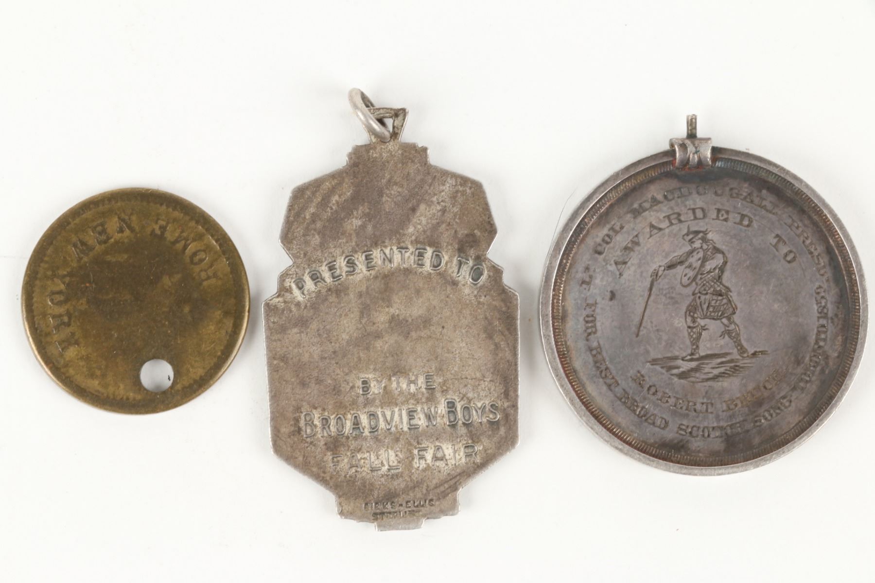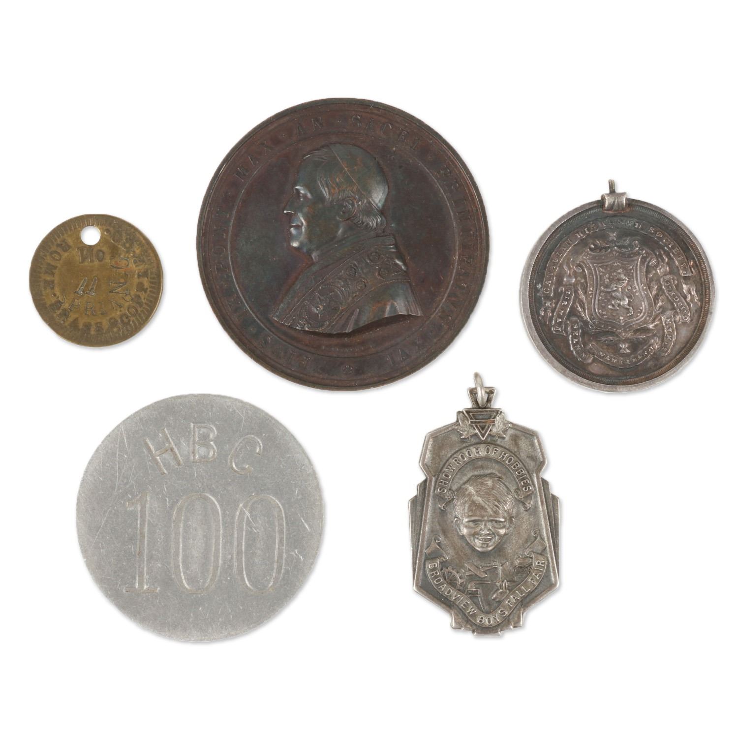 Five (5) items. One (1) Hudson's Bay "100" arctic aluminum token. Two (2) sterling silver badges. One (1) bronze commemorative medal. One (1) brass employee badge. 1" to 2". $150-250.