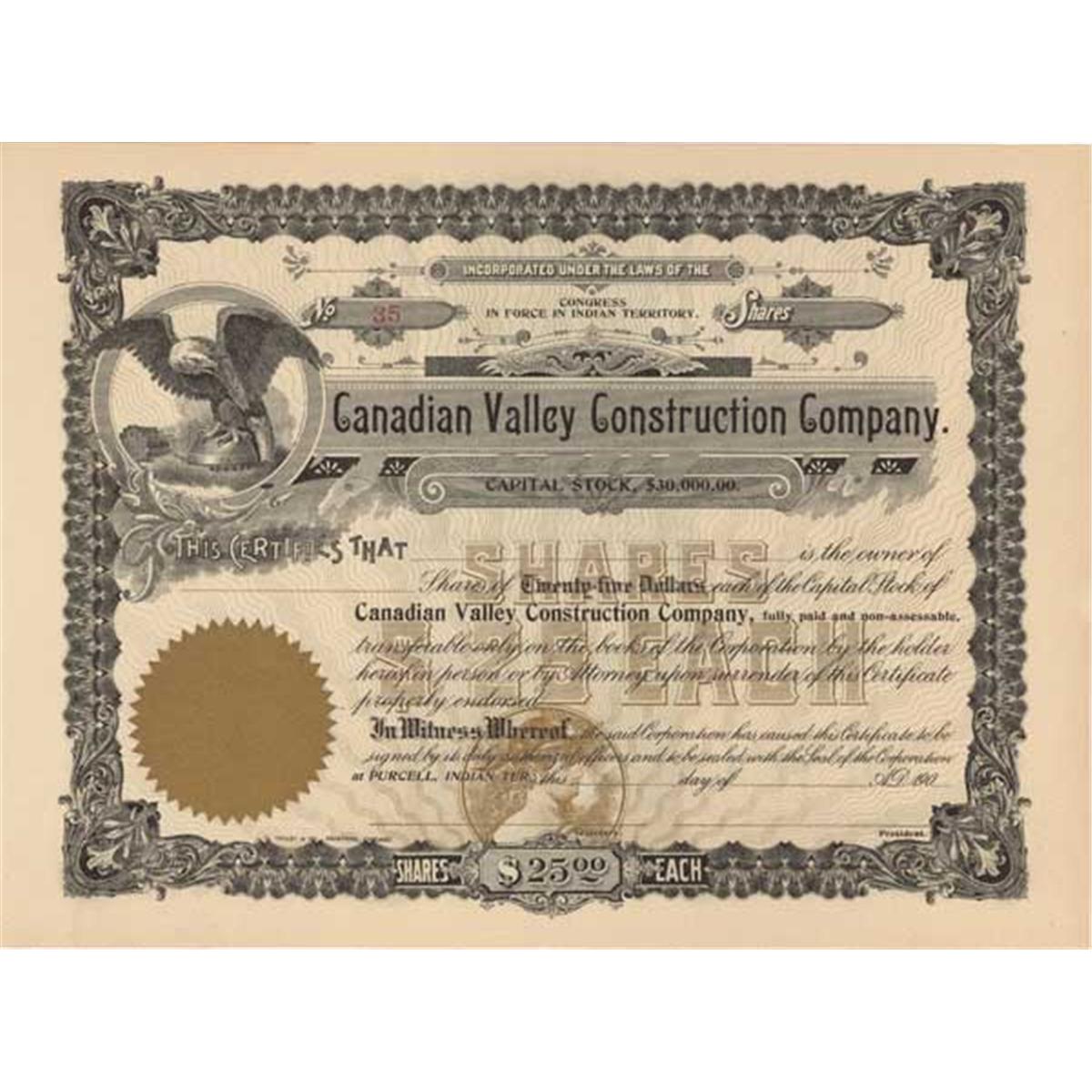 190-, Indian Territory. Unissued stock certificate. Black / White. Vignette of an eagle at upper left. Gold underprint and gold underprint vignette of a mythic female at bottom center. Gold seal.