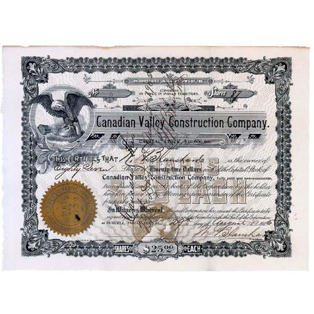 The Canadian Valley Construction Company was involved in the construction of the Oklahoma Central Railway. The route, running from Lehigh to Chickasha, Oklahoma, primarily functioned to transport coal from Lehigh’s mine 1905, Purcell OK Indian Territory. Stock certificate. Black / White. Vignette of an eagle at upper left. Gold underprint and gold underprint vignette of a mythic female at bottom center. Gold seal.