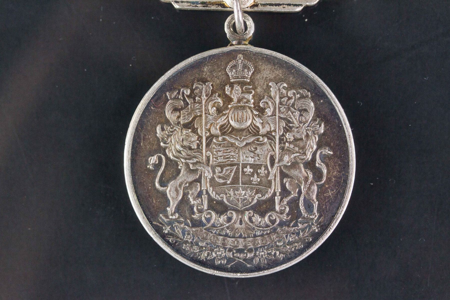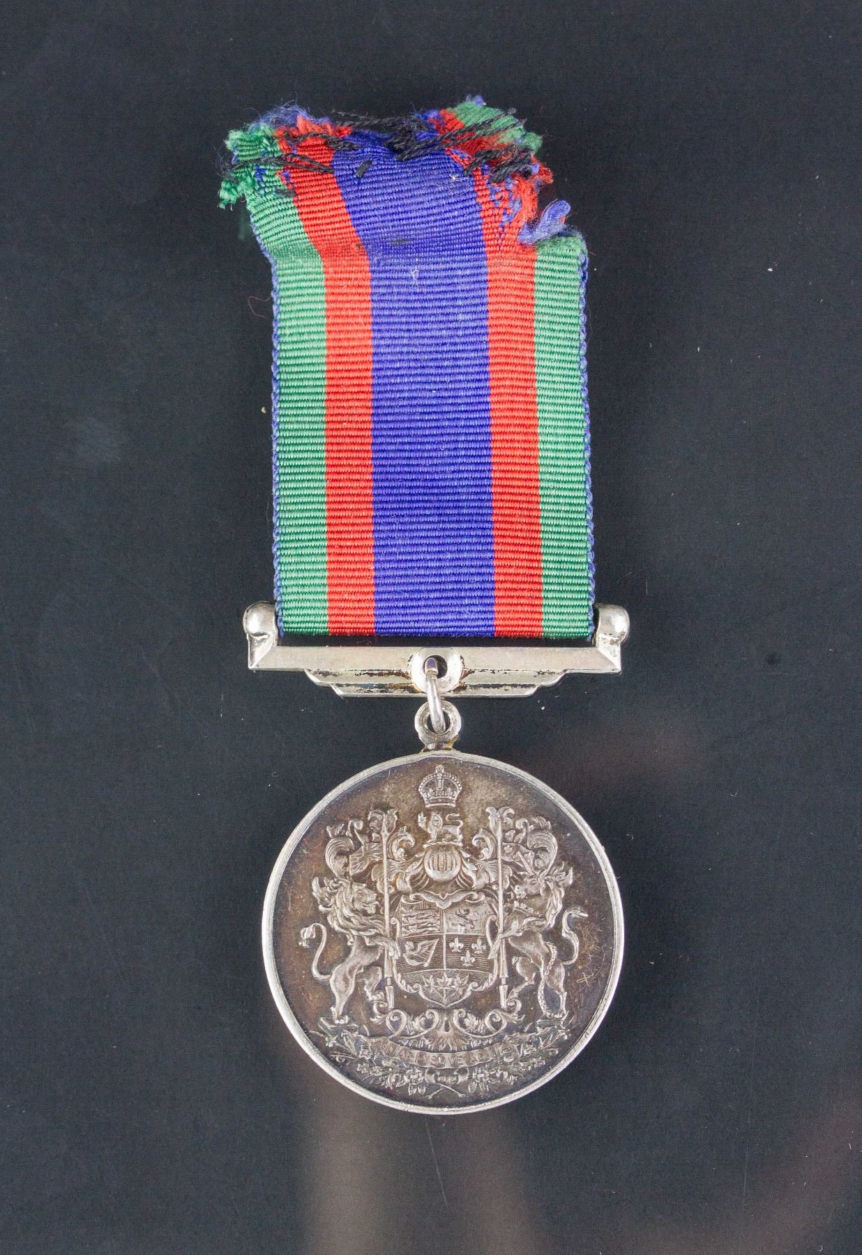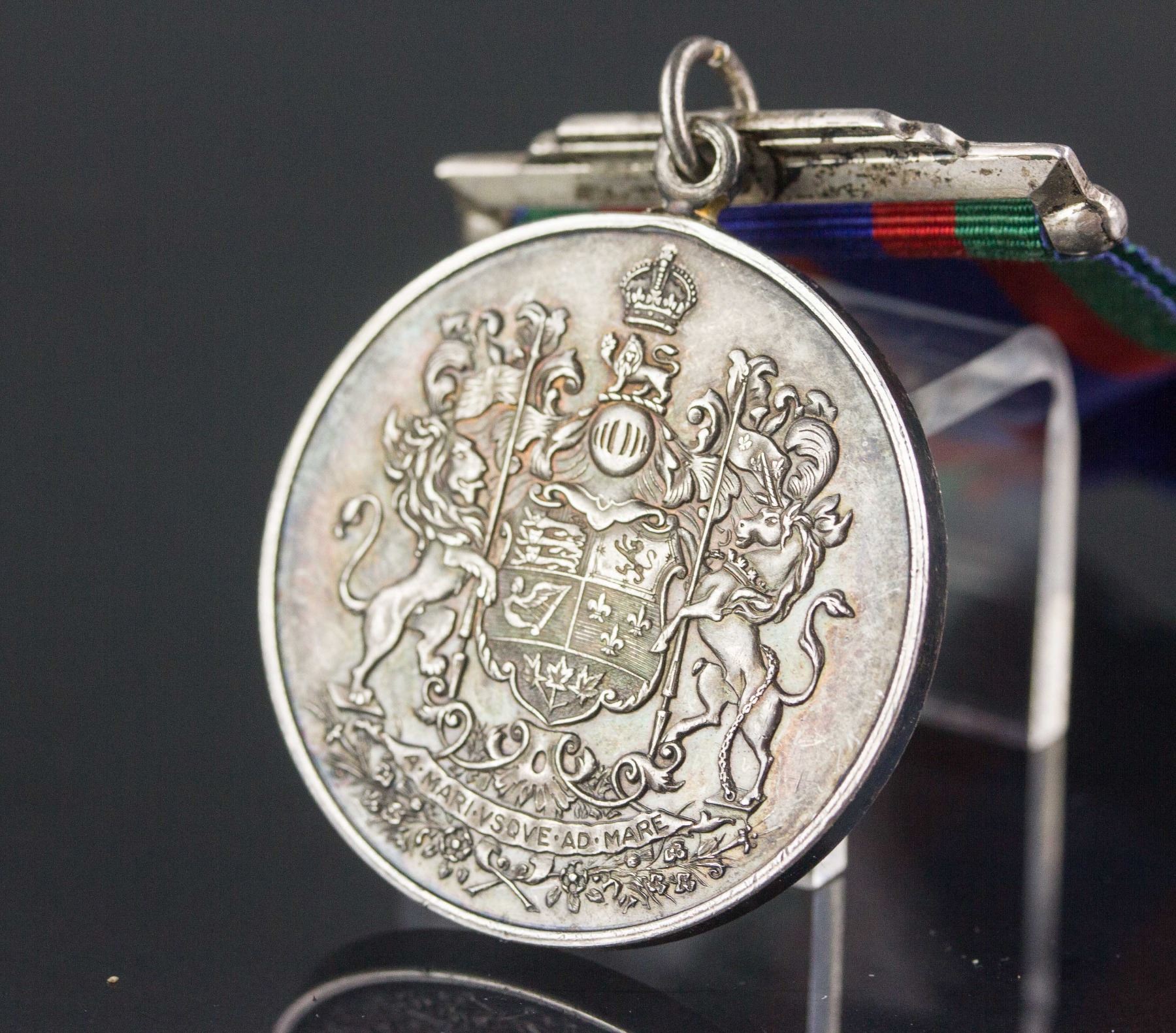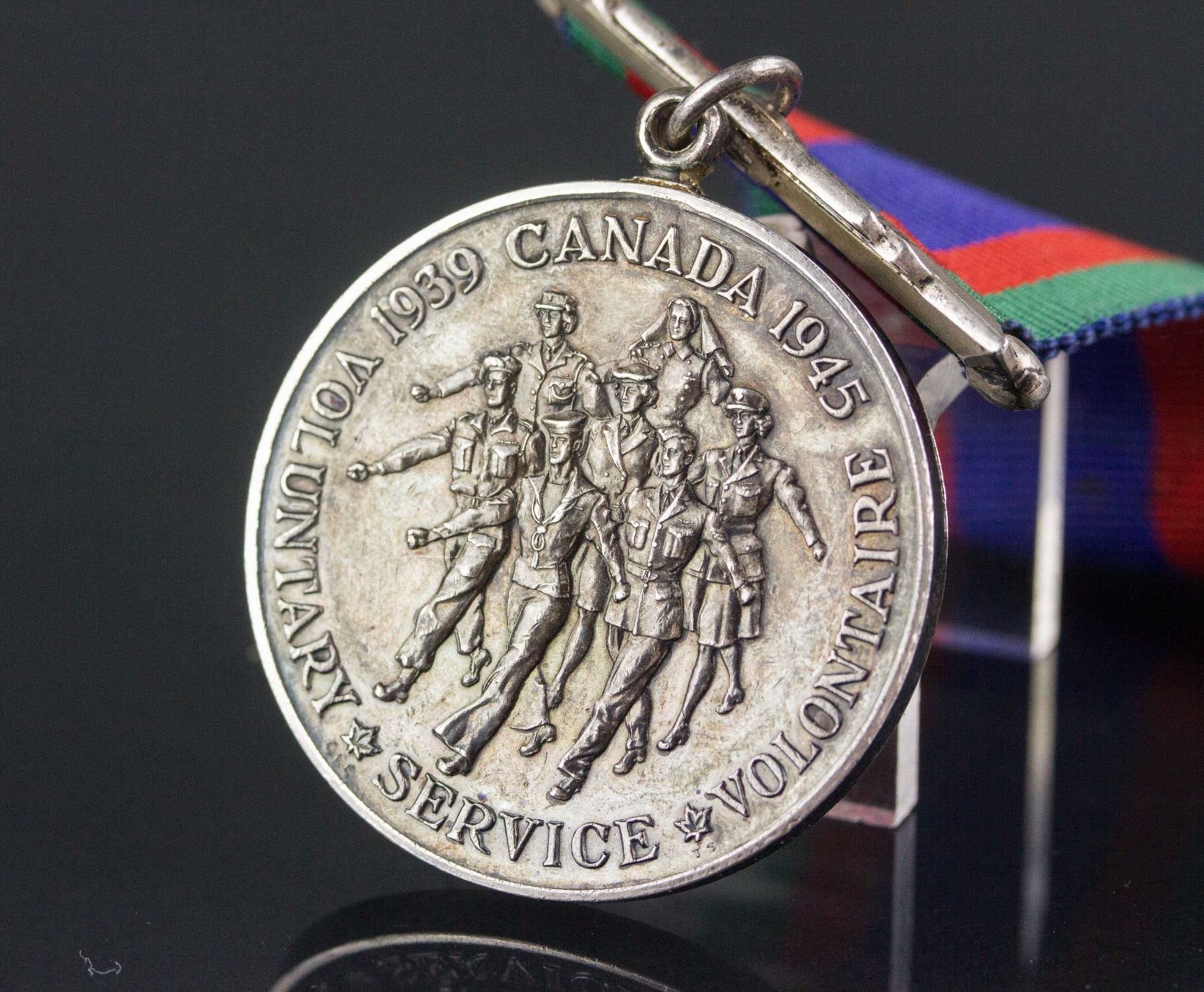 Canadian volunteer service medal; of circular shape with band; obverse depicting seven marching figures, representing men and women of the army, air force, navy and nursing service, inscribed with 1939 CANADA 1945 VOLUNTARY SERVICE VOLONTAIRE; reverse shows the coat of arms of Canada; 11 cm x 3.7 cm x 0.3 cm, 36 grams