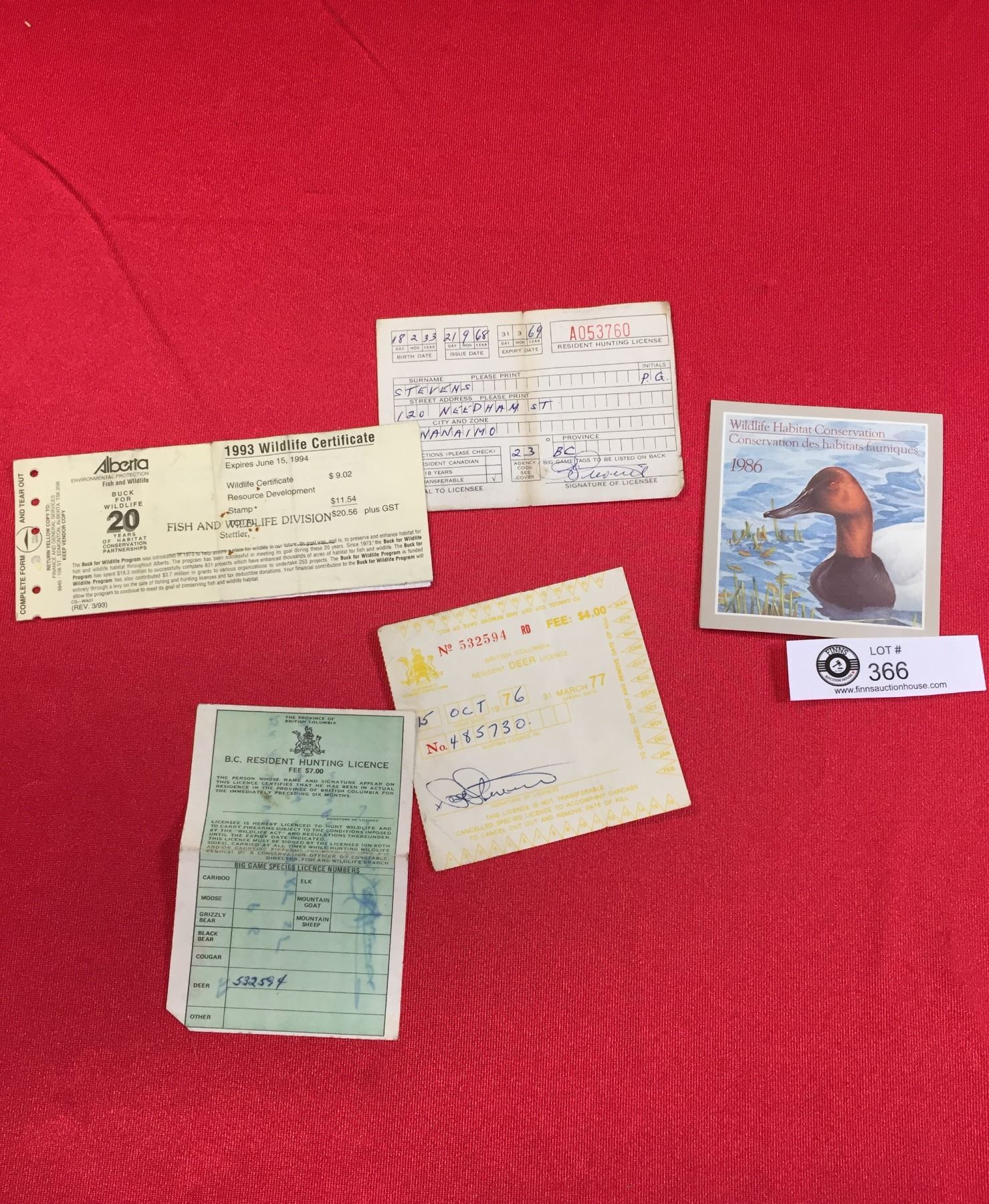 Canadian Wildlife Habitat Conservation Stamps. 1986 Plus A Lot of Hunting Licenses