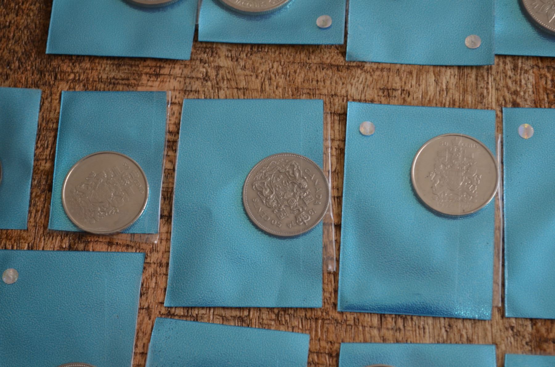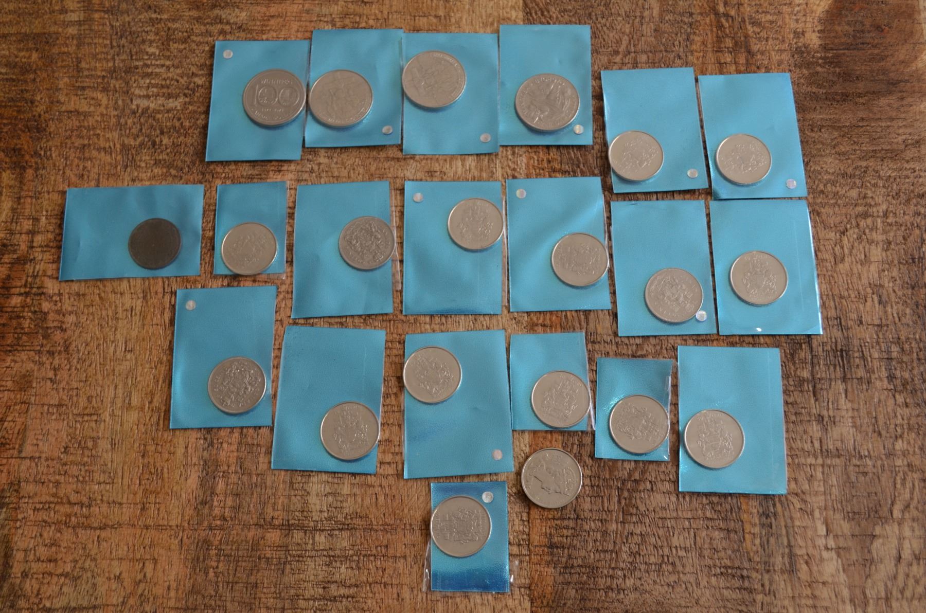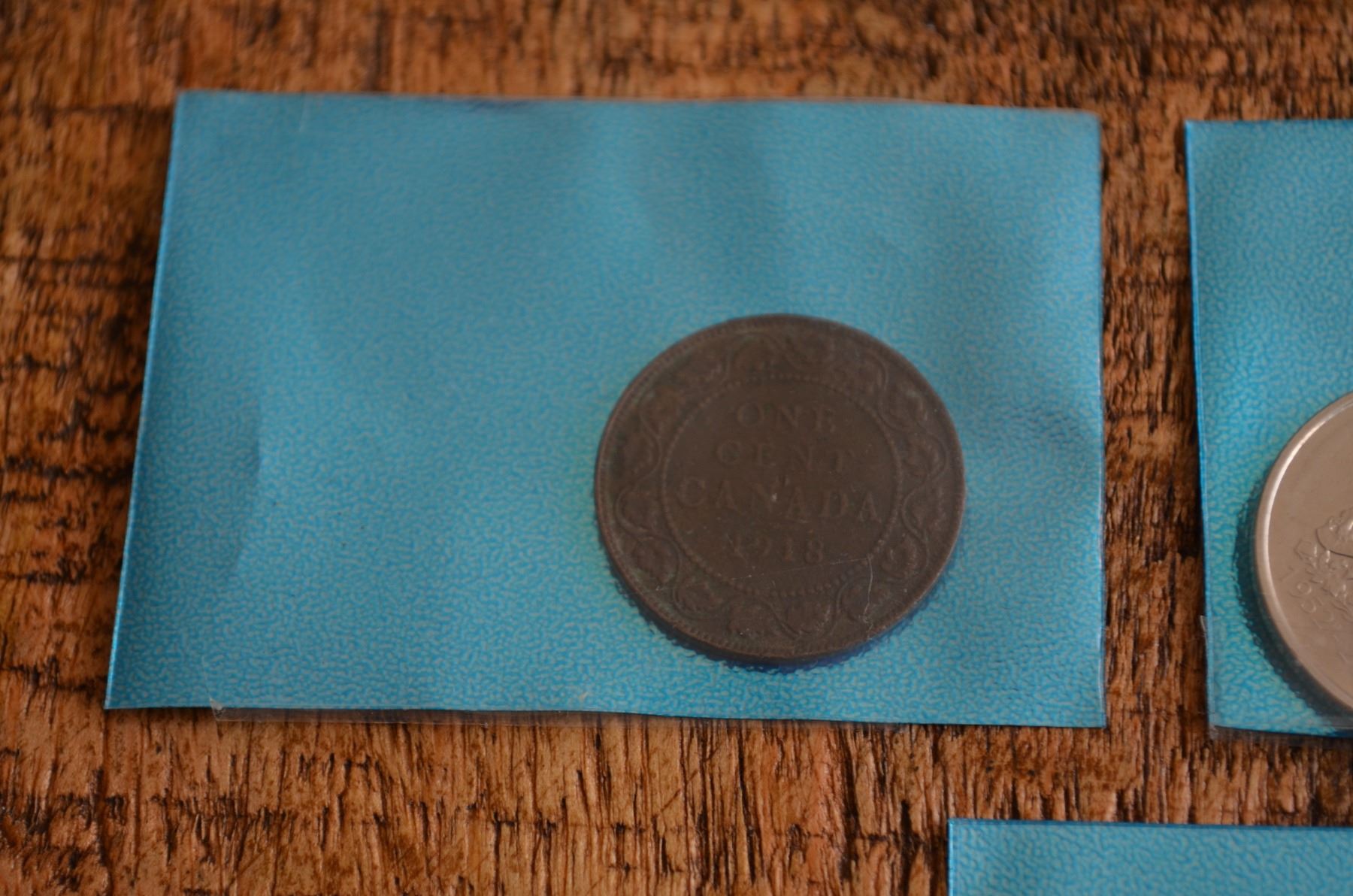 Four $1 coins, 16 50 cent coins, and a 1918 one cent coin