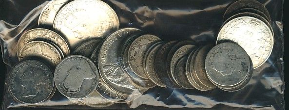 Canadian decimal lot. Interesting lot of Vic 1¢(8), 10¢(1), 25(6), Edw(13), Geo V(1), 50¢ geo V(3) & Silver Dollars 1935, 1936(3) and 1949. Good to EF all with legible dates. Lot of 37 pcs.