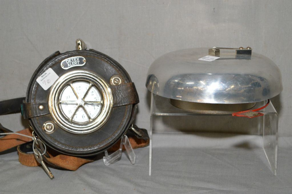 Canadian made "The Guardsman" alarm bell and a Hardinge Bros. Detex Alert watchman's clock