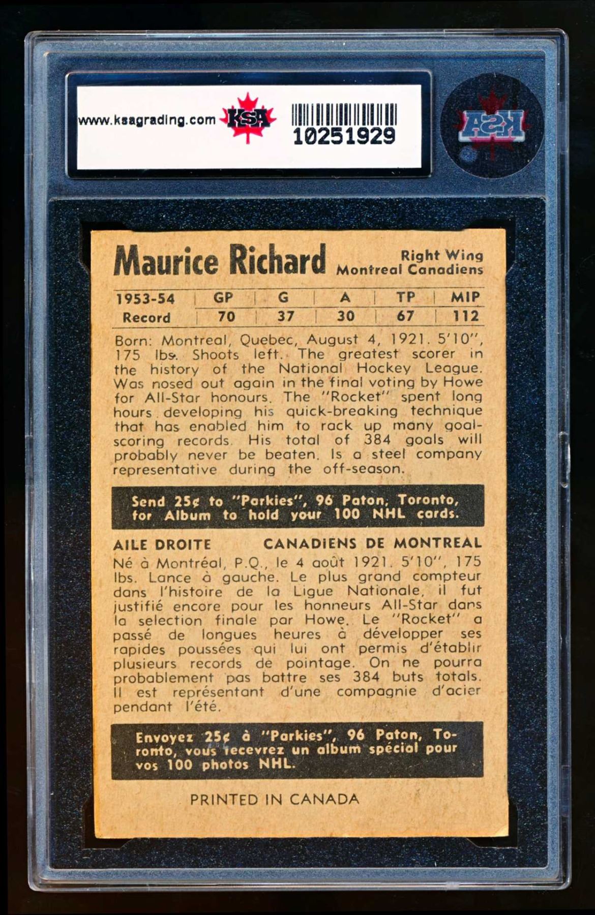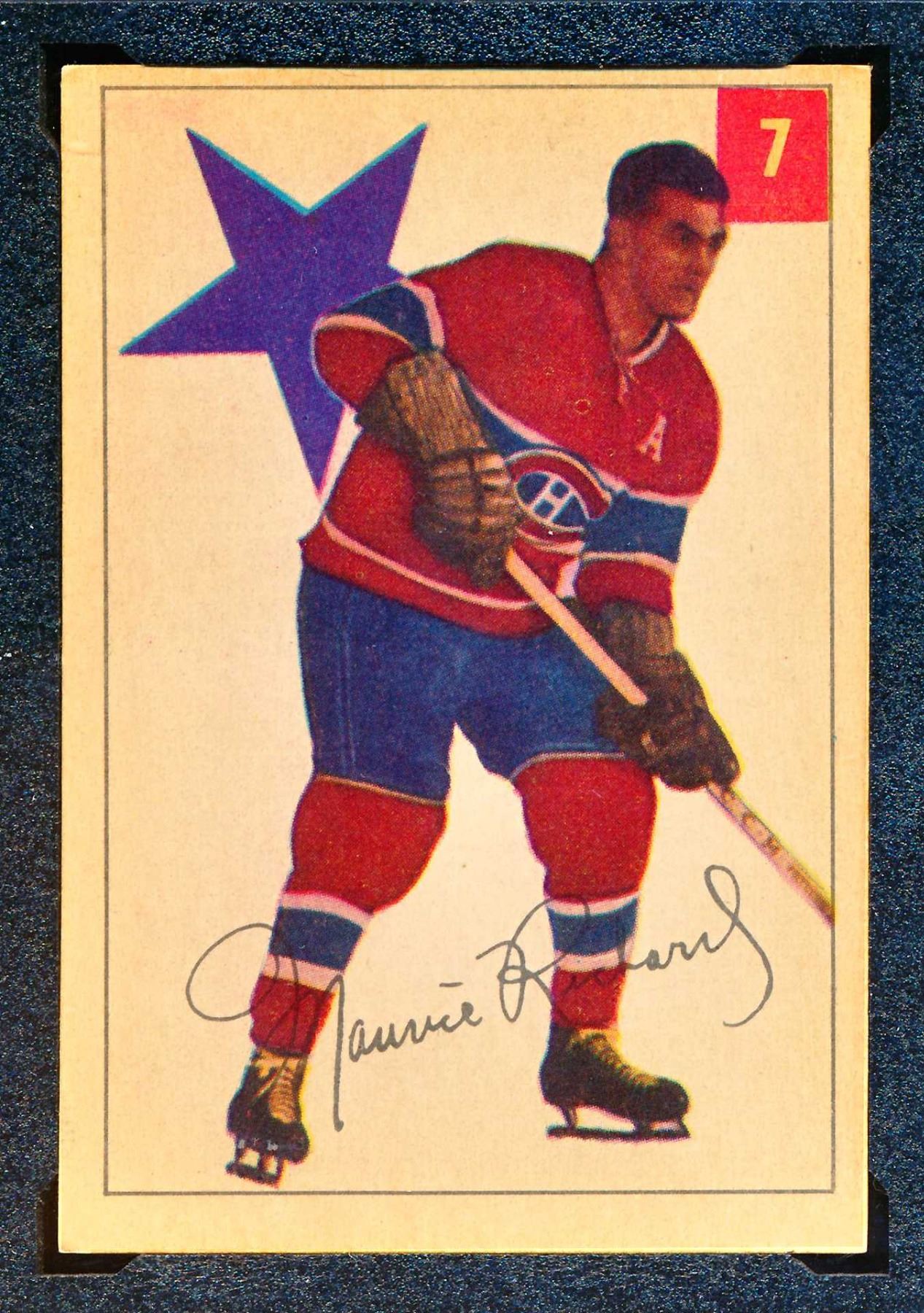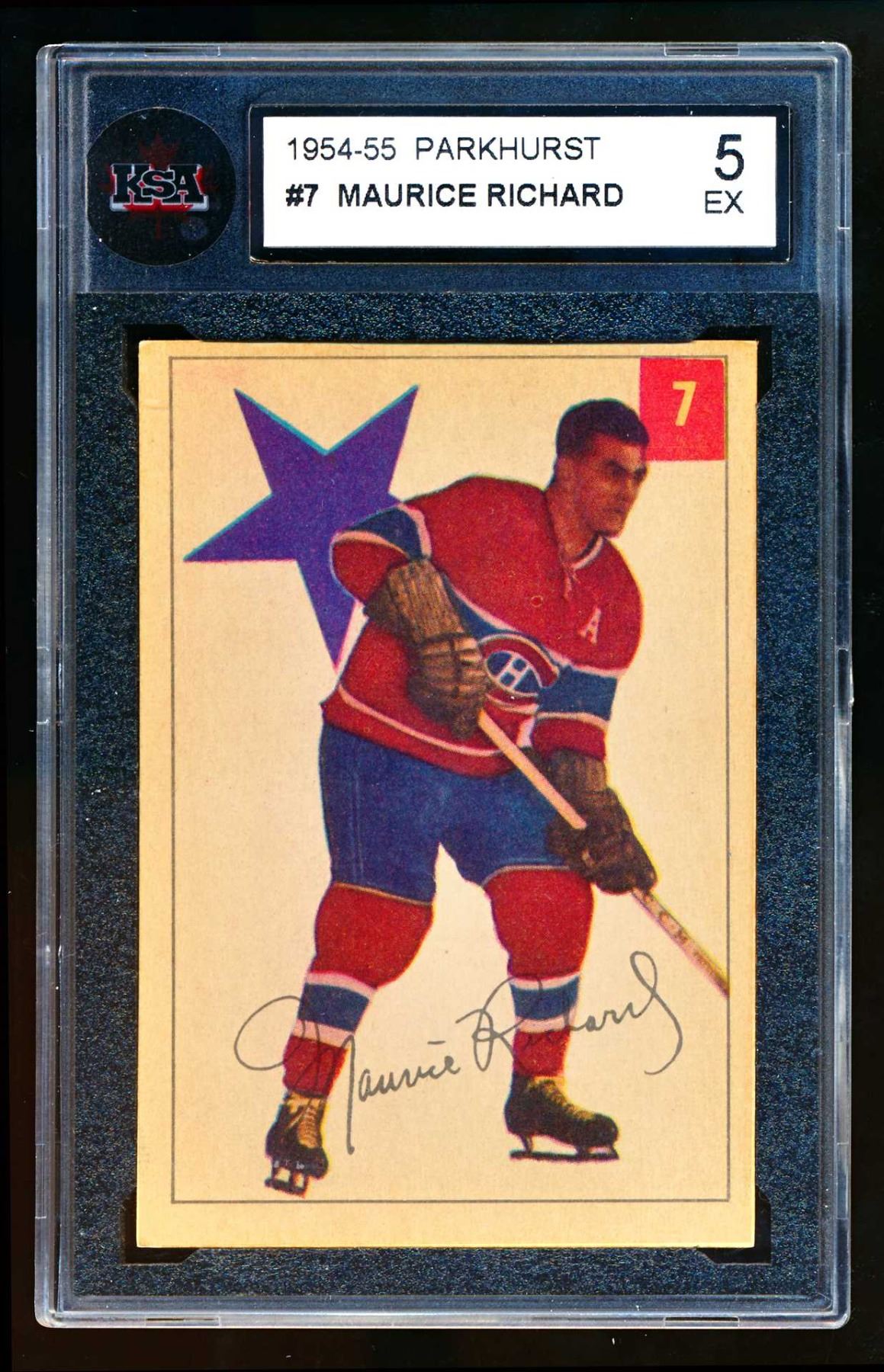 Canadiens Maurice Richard #9, (1954-55) Card #7, printed by Parkhurst graded KSA: EX-5.