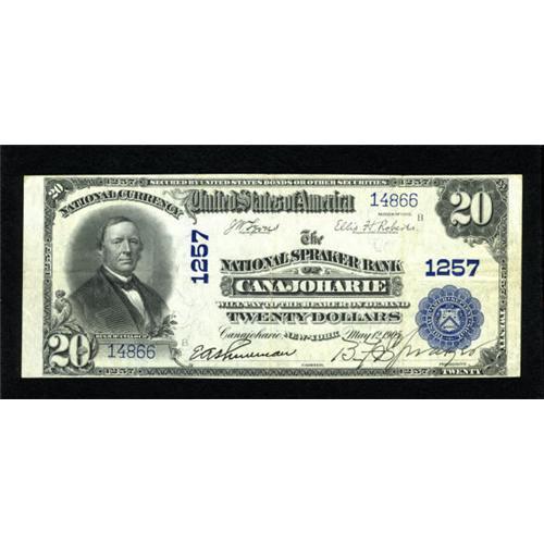 <B>Canajoharie, NY</B></I> - $20 1902 Plain Back Fr. 650 <B>The National Spraker Bank</B></I> Ch. # 1257<BR> This is a perfect representative from this private name bank. B. F. Spraker signed the note as President. The paper is perfectly original and the embossing deep. <B>Very Fine.</B></I><BR><I>From The Thomas A. Bergin Collection</B></I><BR><BR><b>Shipping:</b> Coins & Currency (<a target="_blank" href="http://www.heritageauctions.com/common/shipping.php">view shipping information</a>)