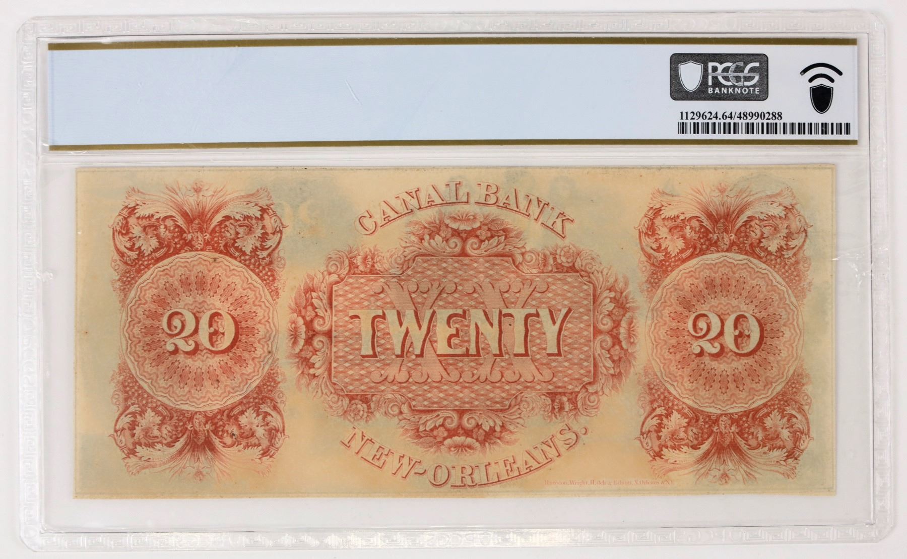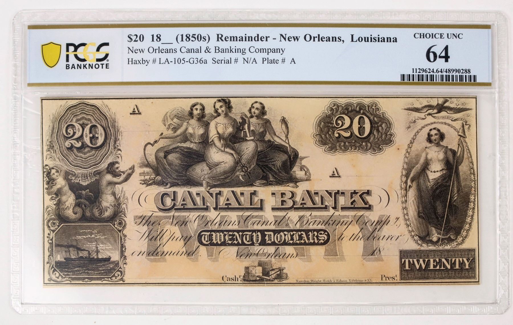 PCGS certified Choice Unc 64. $20 18__ (1850s) Remainder note from the New Orleans Canal & Banking Company. Haxby # LA-105-G36a. No serial number, plate # A.