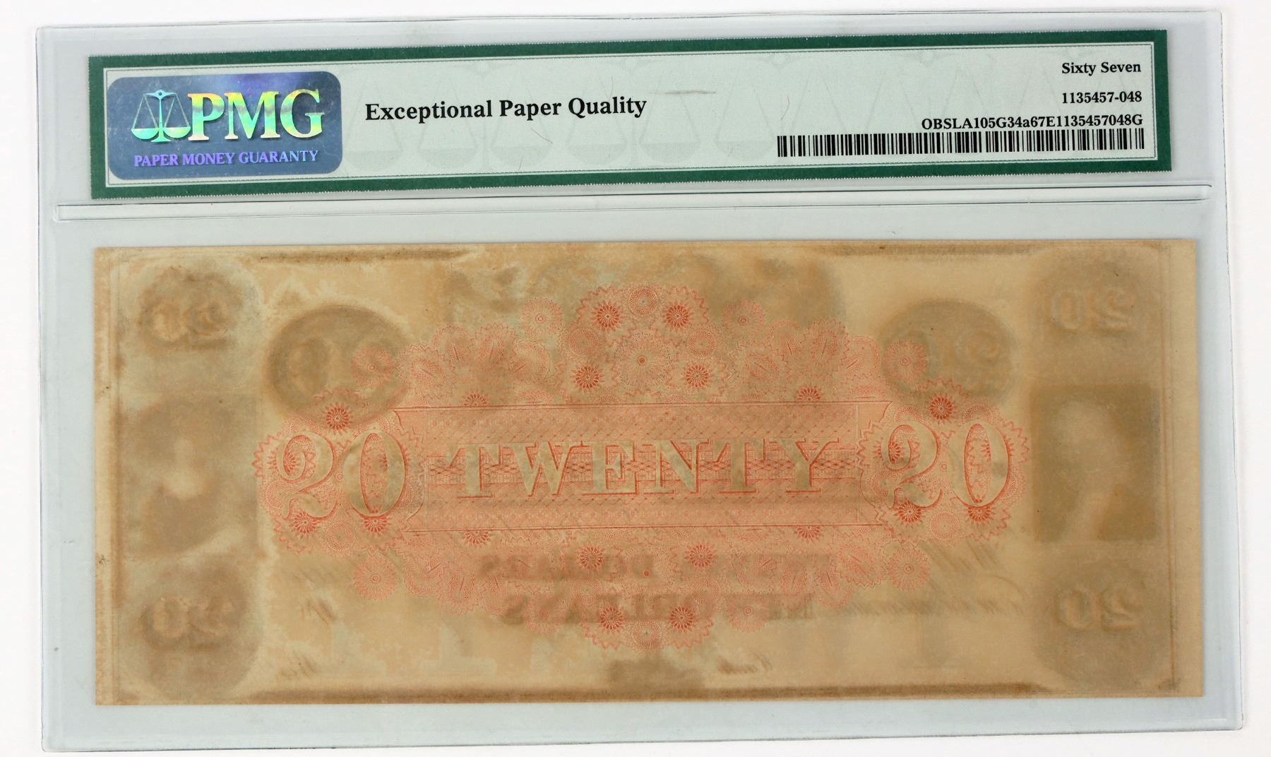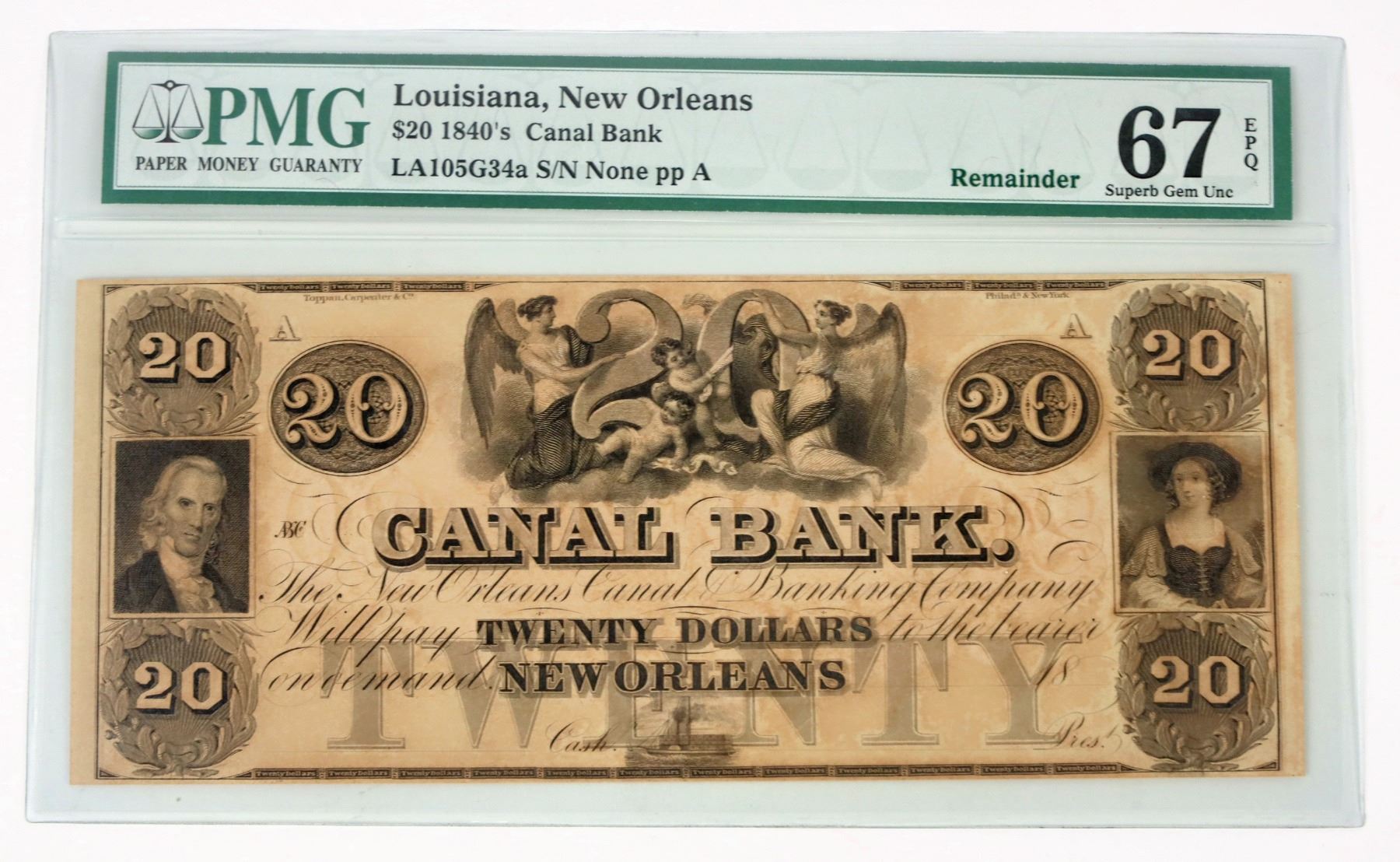 PCGS certified Superb Gem Uncirculated 67 Exceptional Paper Quality. $20 1840s New Orleans Canal & Banking Company. Haxby LA-105-G34a. No serial number. Plate # A.