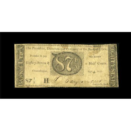 <B>Canandaigua, NY- Bank of Utica</B></I> 87 1/2¢ Sept. 1, 1815 G194<BR> A very tough note from the Schingoethe sale of March 2006. This is a rare denomination, especially from New York, with this piece a likely Rarity-7 example. <B>Very Good</B></I>,<B> </B></I>with a few small repairs and the odd restoration or two, although the overall appearance is quite acceptable. <BR><I>From The Collection of a Louisiana Gentleman.</B></I><BR><BR><b>Shipping:</b> Coins & Currency (<a target="_blank" href="http://www.heritageauctions.com/common/shipping.php">view shipping information</a>)