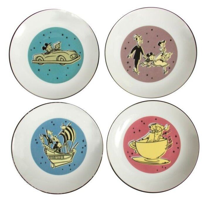 (Disneyland, c.1995) A limited edition sold in The Disney Store around the time of the park's 40th Anniversary. This "Canape Plate Set" includes (4) plates with imagery inspired by early Disneyland promotional artwork, and comes in its original green box and packaging. Each plate measures 6" in diameter within their 6.25"x6.25" and 2.25" tall box. This set is in fine condition with some wear to the outer box.