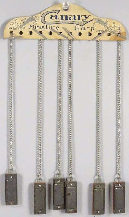 Canary Miniature Harp Store Display with product. Very good condition. Display card measures 5 X 1 1/2 inches.