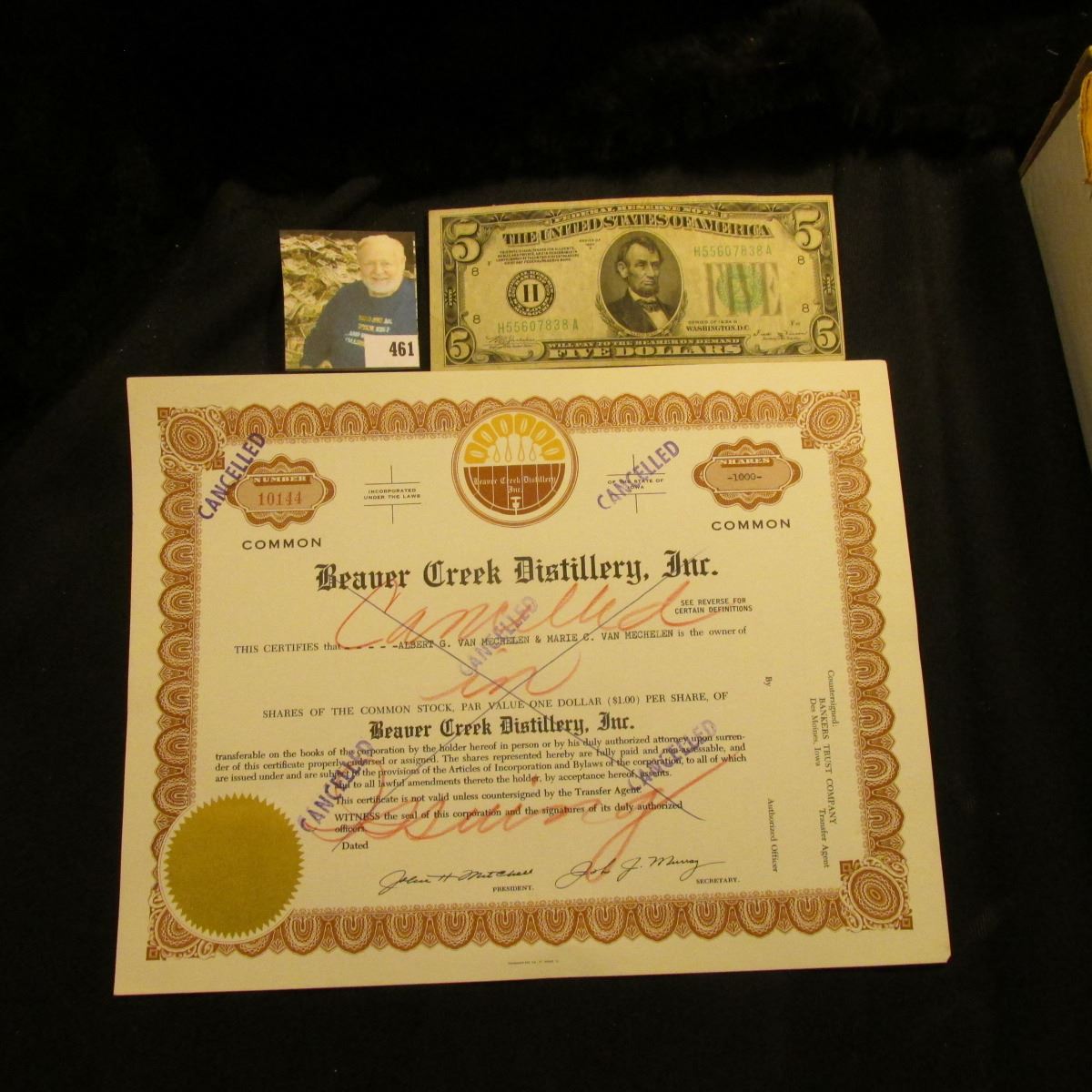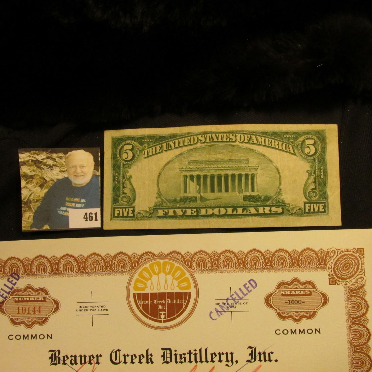 Cancelled Stock Certificate for 1000 Shares "Beaver Creek Distillery, Inc…State of Iowa"; & Series 1934B $5 F.R.N. St. Louis, Mo., signed by Fred M. Vinson, Secretary of the Treasury, VF.