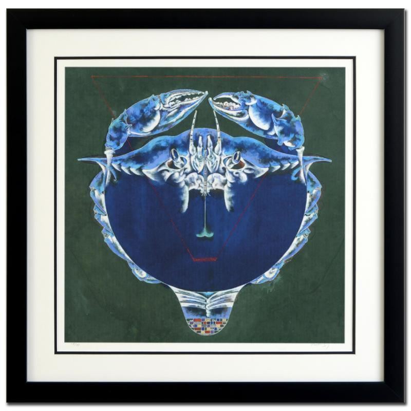 The zodiac is a phenomenological study, formed by coordination between 12 specific constellations in space and birth of one specific human being in time, contrasting 12 signs that guide the meditation of love, fate and purpose of one's life. "Cancer (6/22 - 7/22)" is a limited edition giclee on paper by talented Chinese artist Lu Hong, numbered and hand signed by the artist! This piece comes custom framed. Measures approx. 28" x 28" (with frame), 20" x 20" (image).