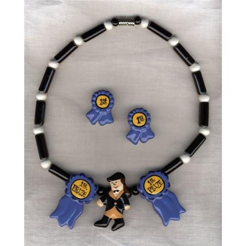 This is a great set by Candace Loheed. The set is probably called ?First Place?. It represents a jockey who has just won the race and has claimed, yes, FIRST PLACE. This is an eye catcher and sure to bring you first place attention and many compliments! This ceramic jewelry are sometime referred to as ?Flying Colors?