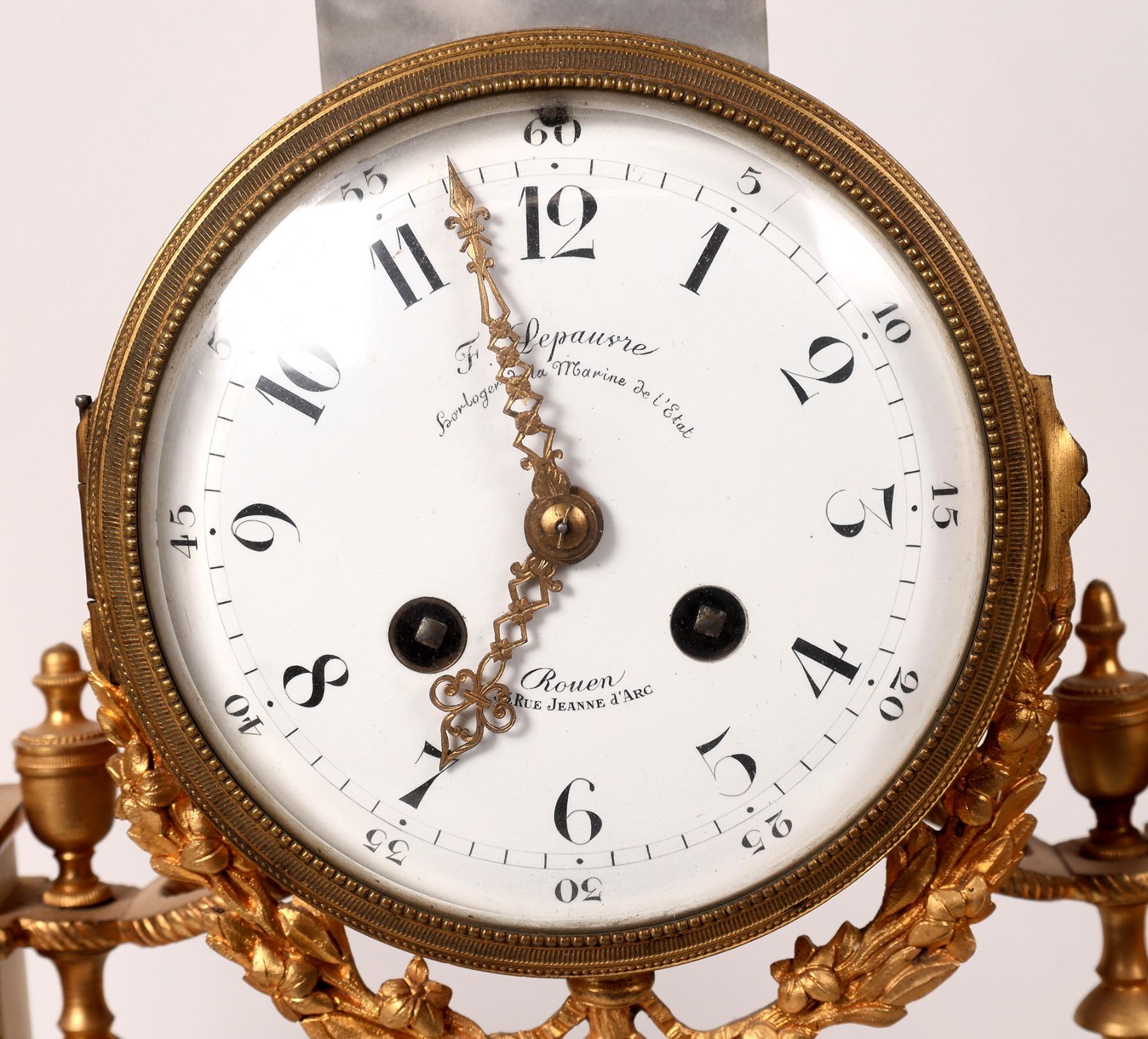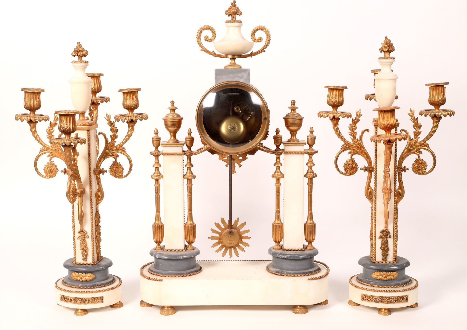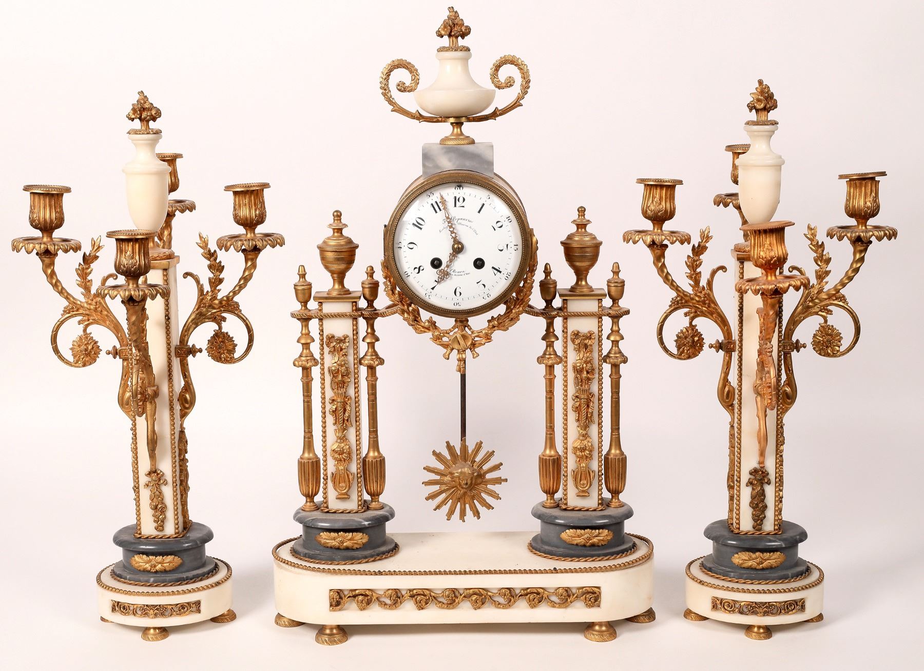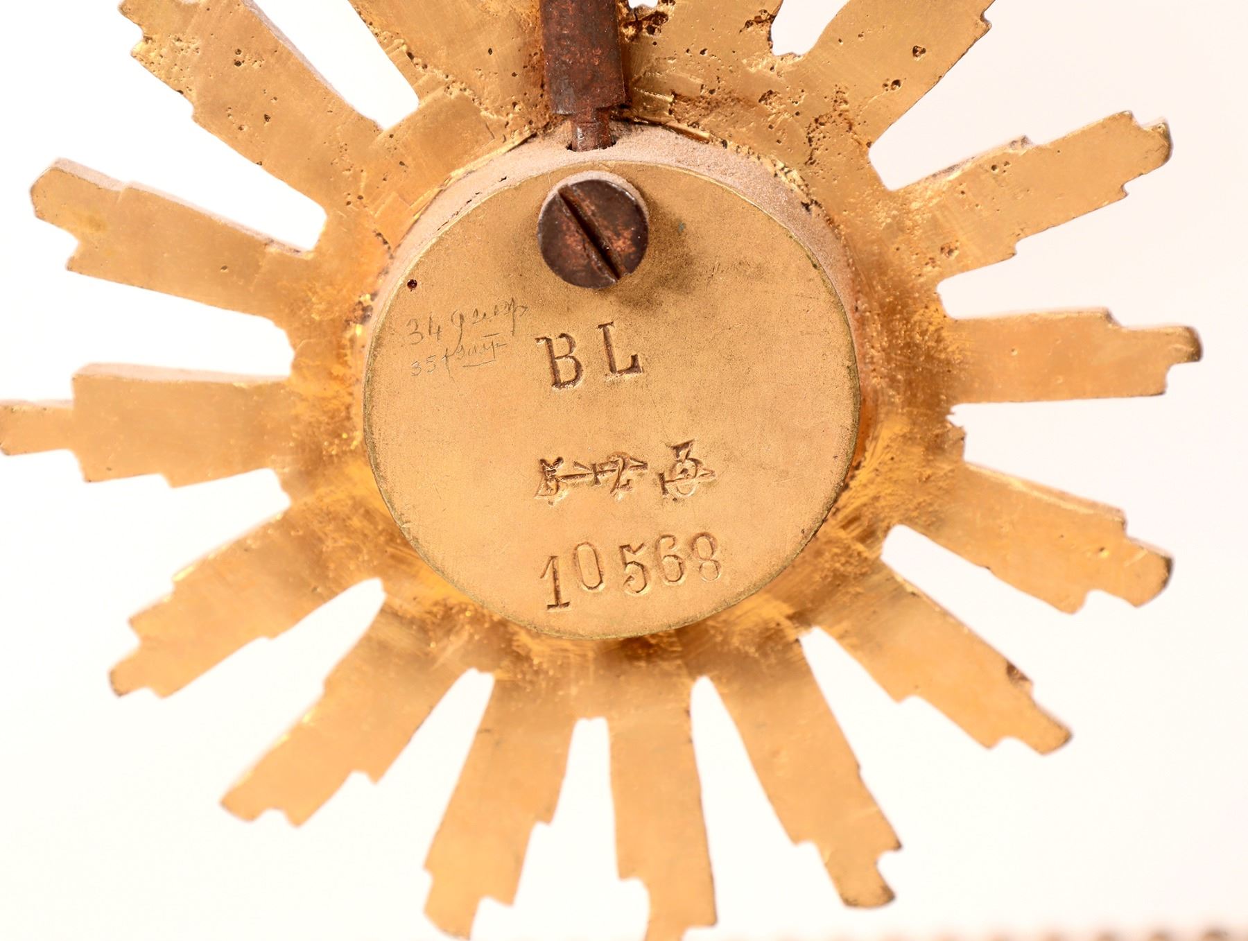 Mantle candelabra clock with matching candelabras. Forged in France by F. Lepauvre. Features a key wind “Bim Bam” 7 days movement. Chimes every 15 minutes and strikes on the hour. Brass casting in French gold finish. There is no key, but it can easily be replaced. Clock measures 5"x 13" x 23" and each candle holder measures 9" x 23" and weighs 46 pounds. It's in good condition for its age. Please see photos for more details.