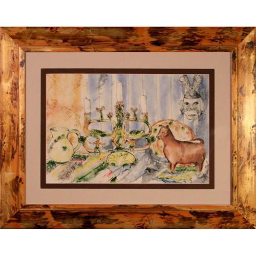 ?Candelabra Still Life? is an utterly fanciful, original watercolor and ink painting by the talented A. Pitts. Pitts used the wonderful combination of watercolor and ink to produce a whimsical scene with many interesting aspects. The focal point of the composition is the large candelabra in the center with its odd shape and small figurative and animal accents. Pitts has used a wet-on-wet technique to build her colors, which is to say that areas of the paper were saturated with water first and wet pigments were added so that they would bleed into each other to create a loose fluidity. This effect is apparent throughout the piece, especially in the areas of the candelabra and tablecloth where the colors blend freely into each other without meticulous attention to detail. The other components of the composition, such as the dog statue and the tribal mask at the top right corner further reinforce the playful feel of the piece. The painting is double-matted in deep brown and light beige to provide some neutrality and let the brighter colors within the composition take center stage. The piece is mounted in a handsome wooden frame that has been painted to give the illusion of aged gold without weighing the work down. Including the wonderful frame this piece measures 28 ½?x 22 ½? and would be an exciting and affordable way to liven up any room in your home.