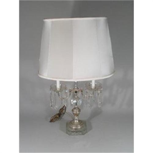 Candelabrum Lamp, 20th c. - Pretty lamp. Silver plated candlestick base with faceted knob supports. Two "U" shaped arms with glass bobeche, with drop prisms. All on glass plinth, some loss to plating. 28"h.