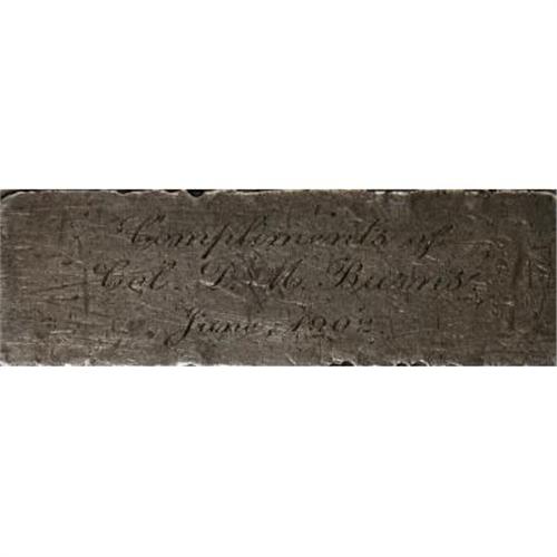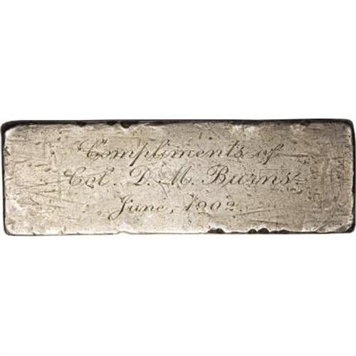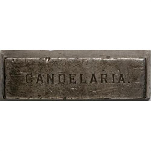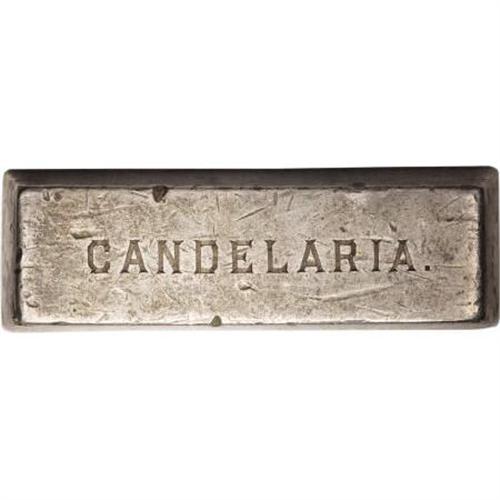 <B>Candelaria Presentation Silver Ingot. 6.6 Ounces.</B></I> This presentation ingot was produced from silver mined in San Dimas, Mexico. Most likely it commemorated the completion of the mill expansion in 1902 and was probably given to a San Francisco investor. The top side of this small, trapezoidal-shaped ingot reads: CANDELARIA. The bottom side is inscribed: COMPLIMENTS OF / COLO. D.M. BURNS /JUNE 1902. A one-of-a-kind item from this important gold and silver mine. Measures: 18 x 56 mm.<BR><BR><b>Shipping:</b> Coins & Currency (<a target="_blank" href="http://www.heritageauctions.com/common/shipping.php">view shipping information</a>)