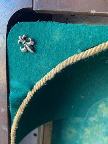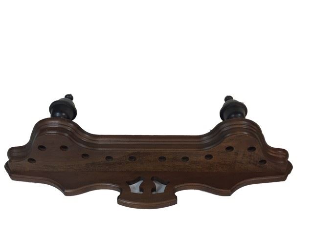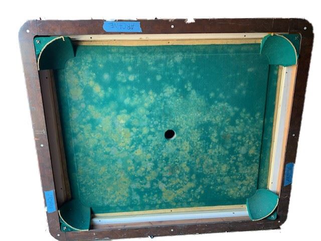 Candie Plantation pool table and shelves 5 piece set- includes pool table top (approx 4'x4'), brown wood hanging wall ball holder (23"x29"), brown wood free standing pool stick holder (one side has been broken off)(43"x32"),and a brown, wood, two-piece wall mounted stick holder (32"x14" each piece). Note table top felt has been water damaged and color has faded.