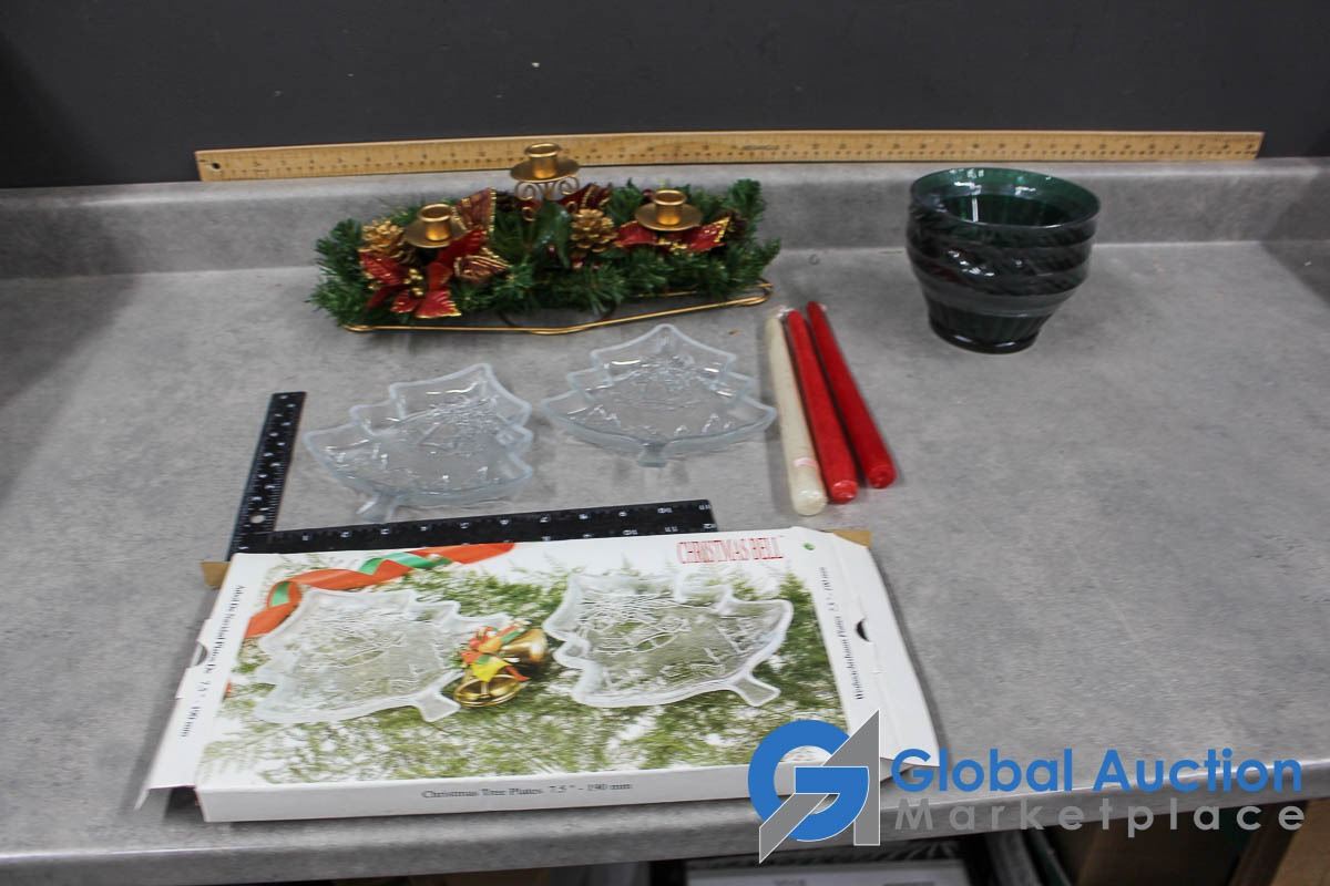 Candle Centerpiece; Candlesticks; Plastic Serving Bowls & Glass Christmas Tree Trays