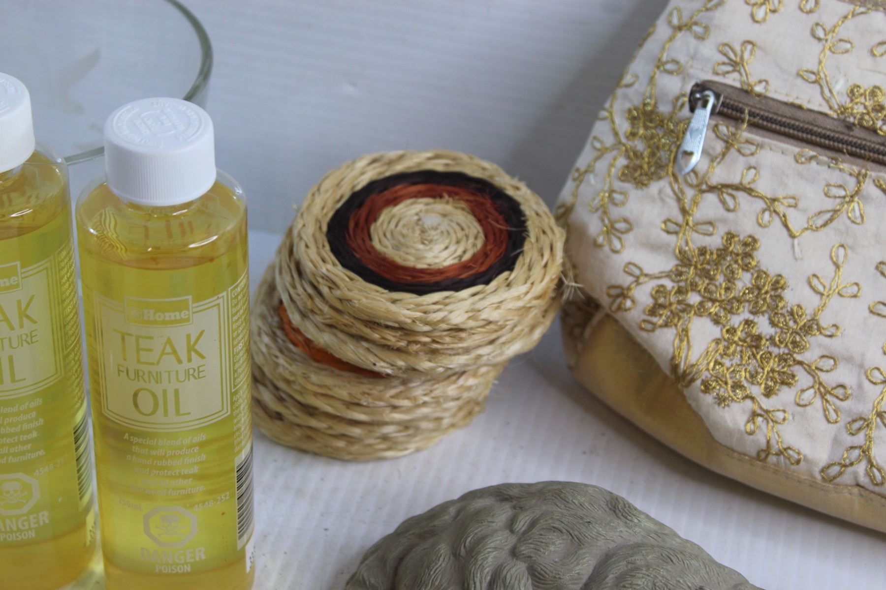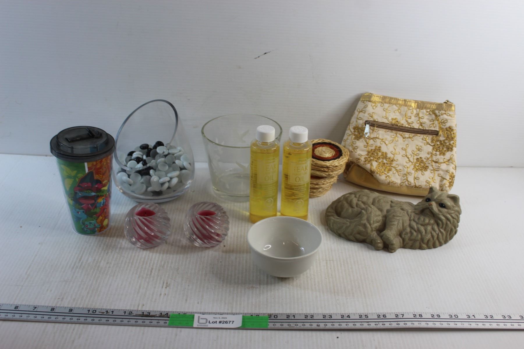 Candle Holders, Laying Cat Decor, Handbag, Teak Furniture Oil, Pokemon Cup, Coasters and Assorted Items