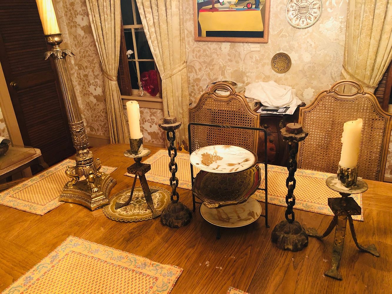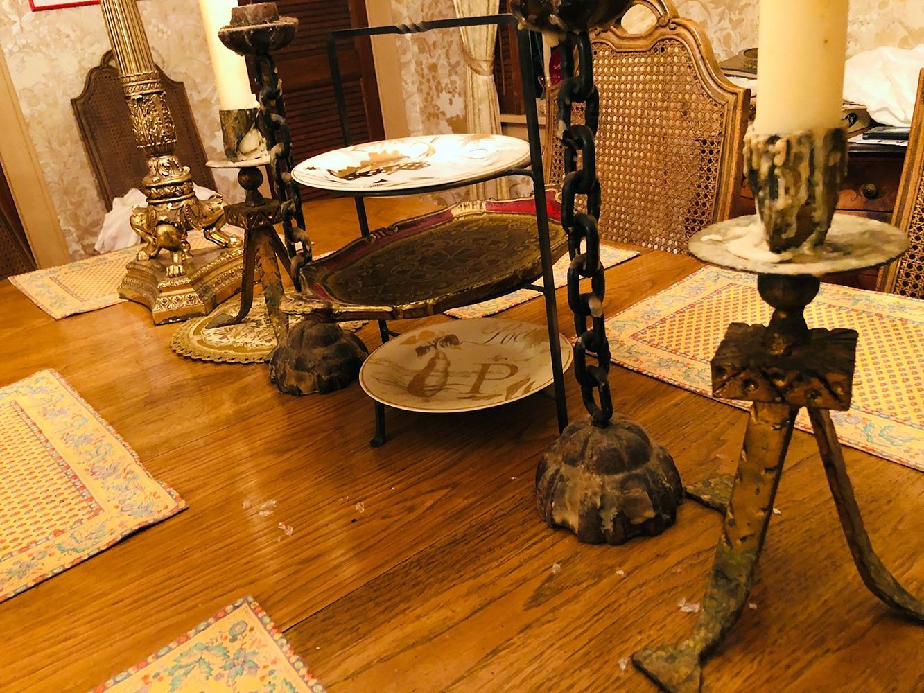 Candle holders, including pair of Arts and Crafts style, pair of wrought iron candle holder, 1 large gothic candle holder, wrought iron pie serving rack. pd estate.