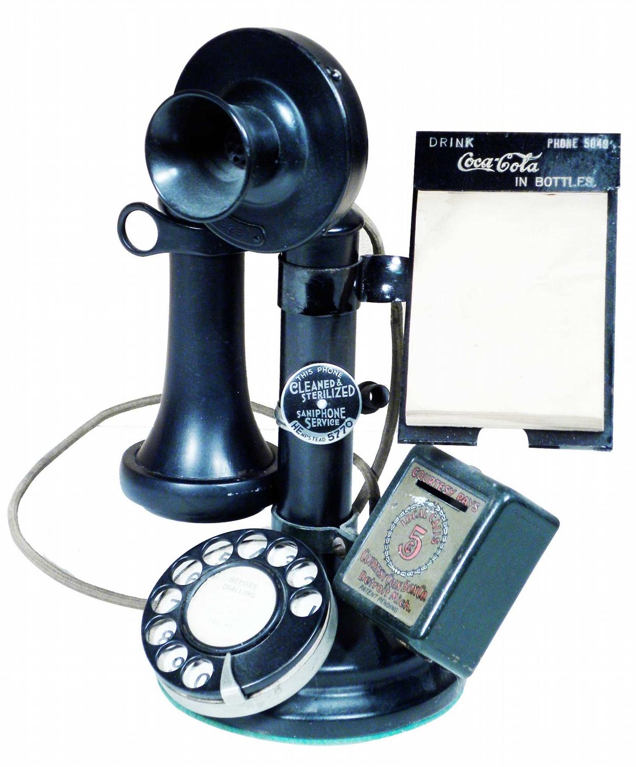 Candle Stick Telephone with Coca Cola Note Pad. Courtesy coin box, 5 cent calls. Cleaned and sterilized button by Saniphone Service. Excellent original condition. 10 3/4 inches tall.