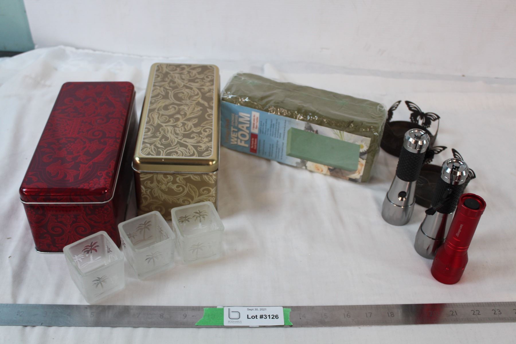 Candle holders, flashlights, foam block, floral tins