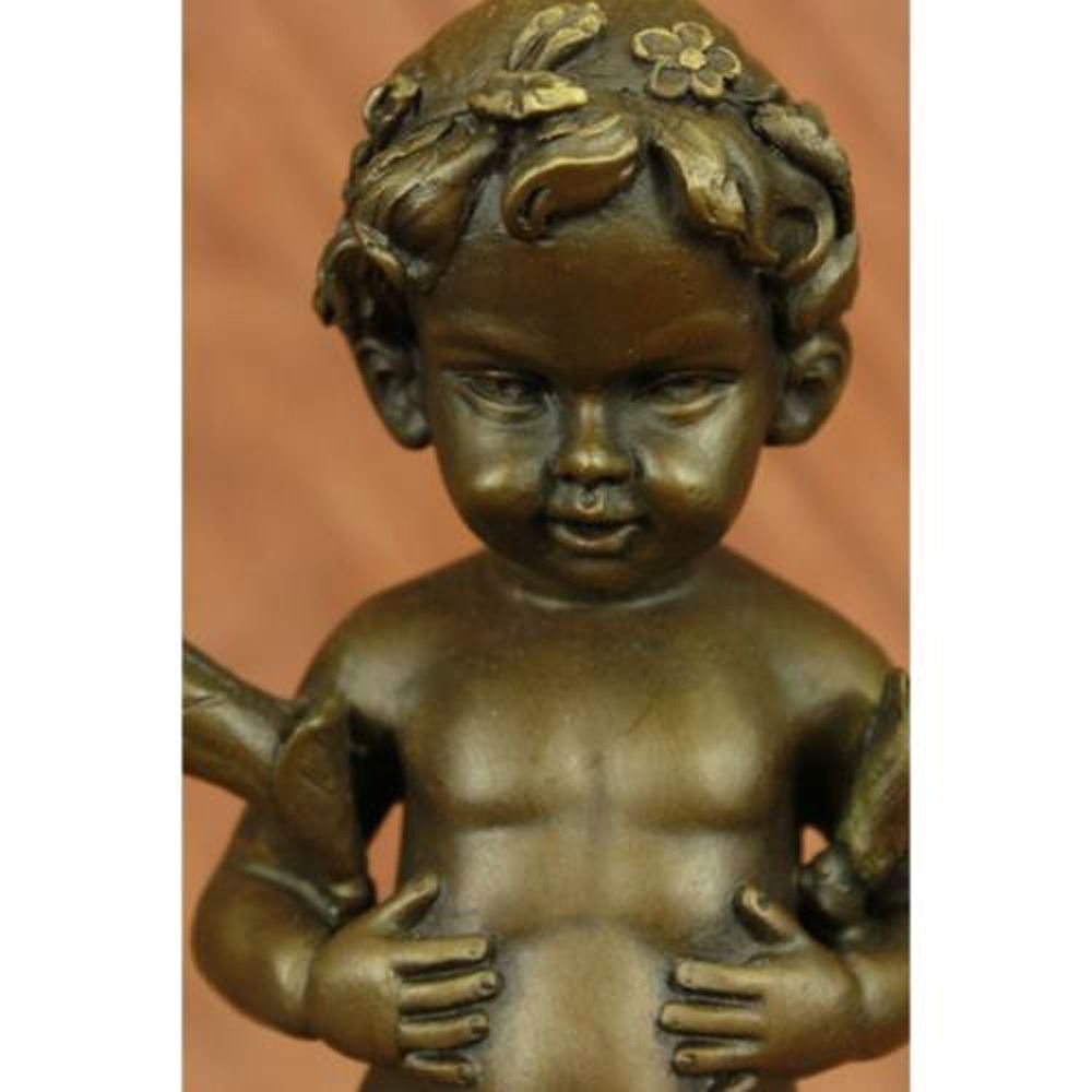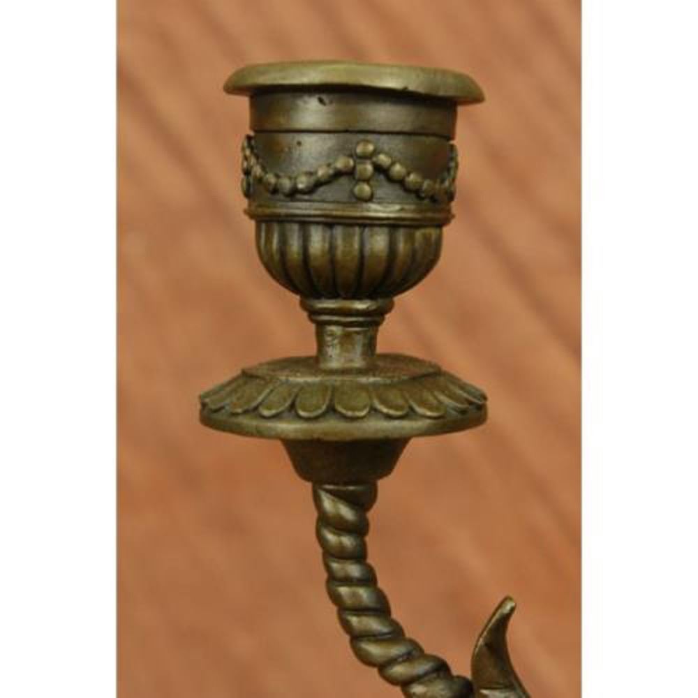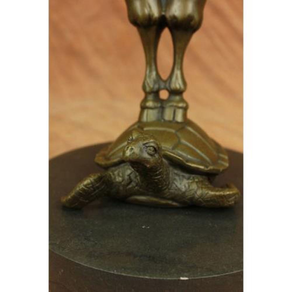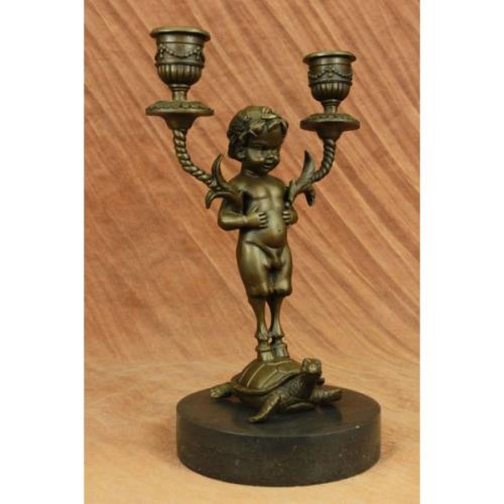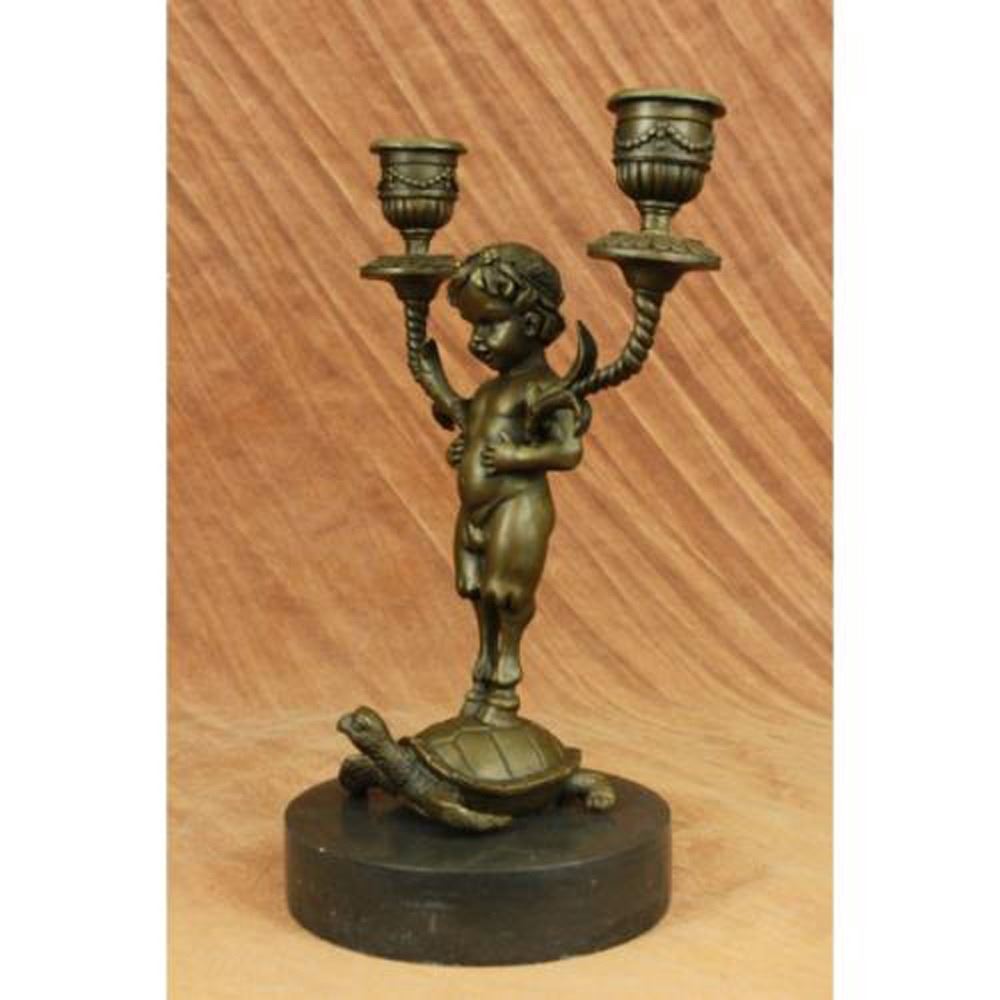Candelabrum held under arms of baby satyr, whose hoofs are implanted on a shell of slow moving tortoise. This brown patina sculpture was cast using the Lost Wax Method and it is mounted on a marble base. Bronze Dimensions with Marble Base: Height 13 X Width 9 inches. Weight: 11 LBS.