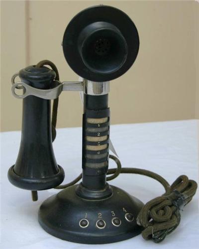 Candlestick telephone has four buttons on base and four nameplate slots on stick portion of phone. Adjustable mouthpiece. Made by Conn. Tele. Company, USA. Overall height approximately 11". Base diameter approximately 5".