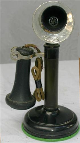 Candlestick telephone with chrome around mouthpiece. Adjustable mouthpiece. Western Electric #329 W. Base approx. 5 ½" diameter. Approx. 12" high. Original condition.